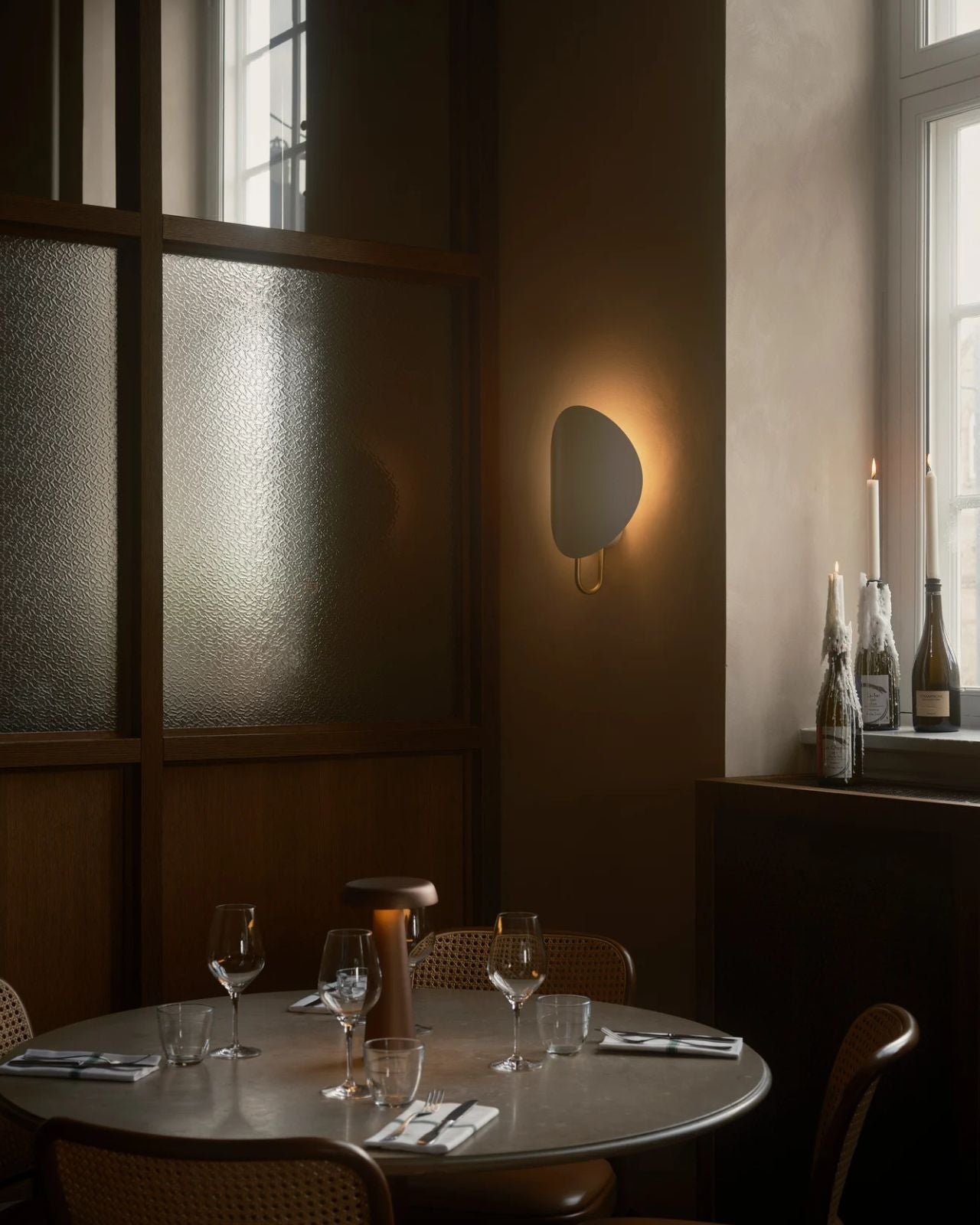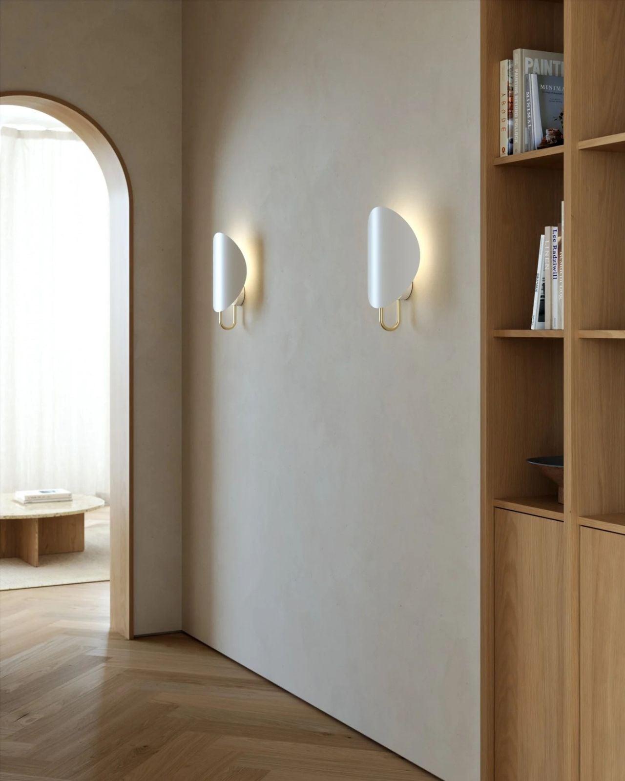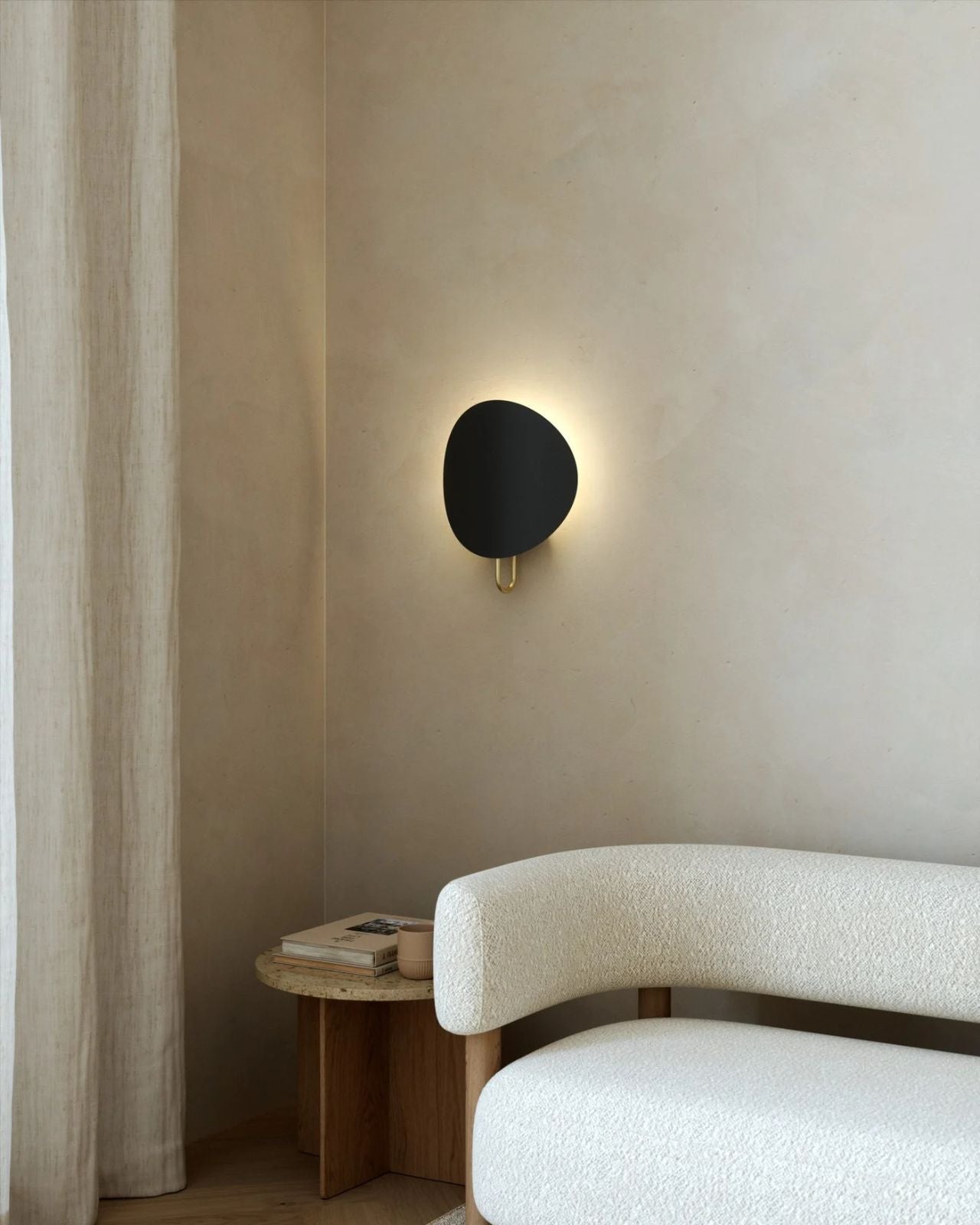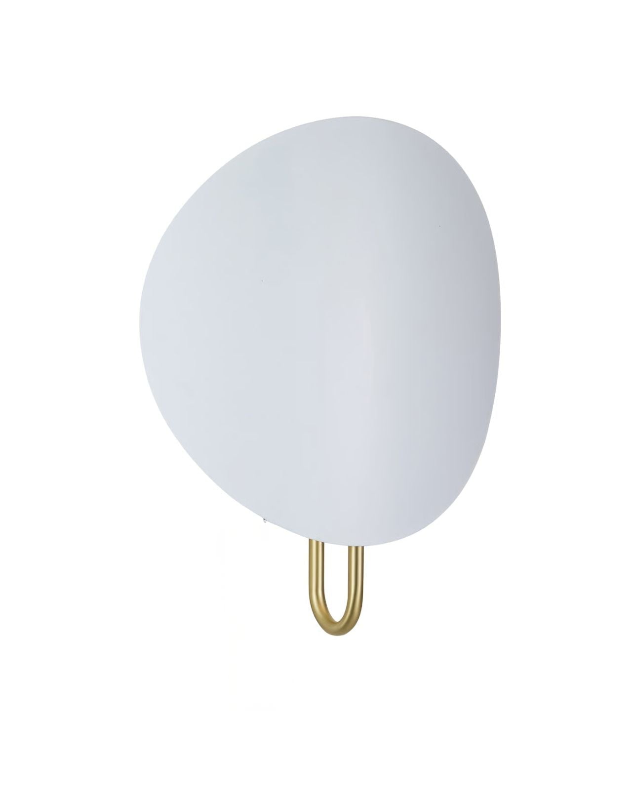 This timeless Danish wall light showcases a subtly curved metal disc shade in a matte white or black finish. Securely attached to a brushed brass U-shaped arm, the shade casts an indirect light to reflect off the wall with an alluring, gentle radiance. Ideal for enhancing modern and contemporary interior spaces.