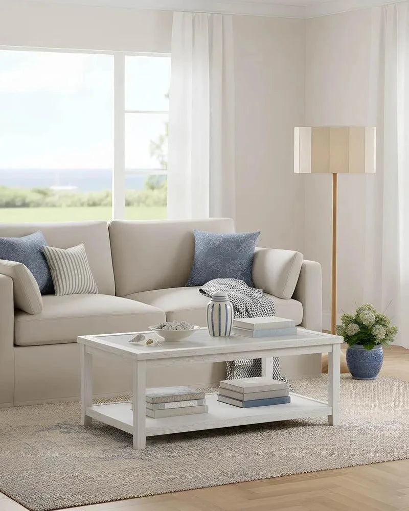 Beige sofa with wooden legs in a room with a wooden floor and a tapered timber floor lamp