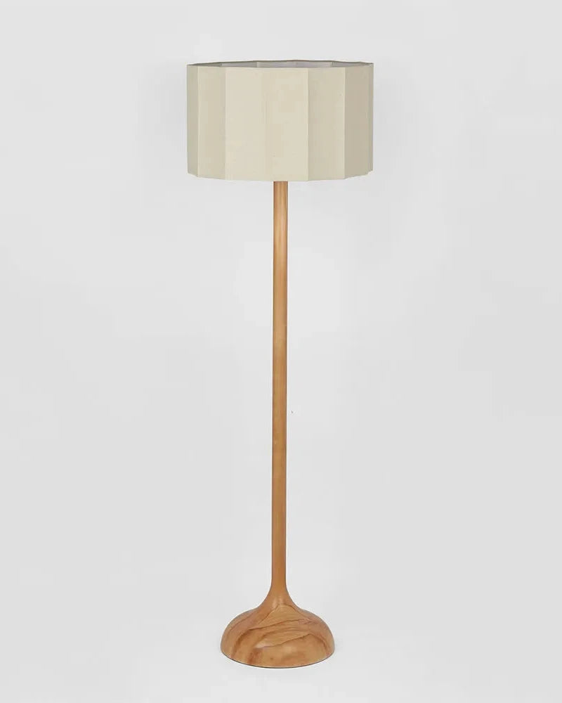 The Pleated Shade & Wooden Floor Lamp is anchored by a sculpted poplar base with a rounded profile and a pleated drum shade crafted from linen. Its gently faceted design adds architectural interest, casting a soft, layered glow when lit. The interplay between the organic warmth of the timber and the tailored elegance of the shade evokes a quiet, modern sophistication.