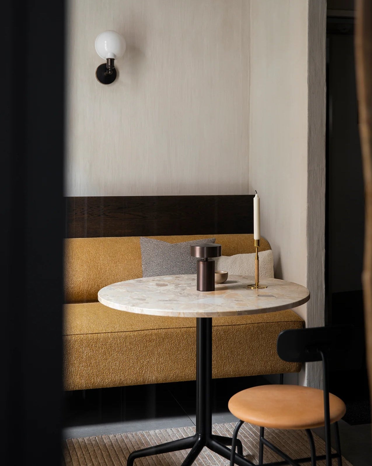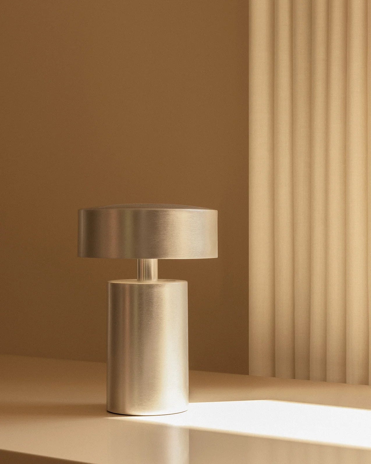 Metallic lamp on a beige shelf with a neutral background