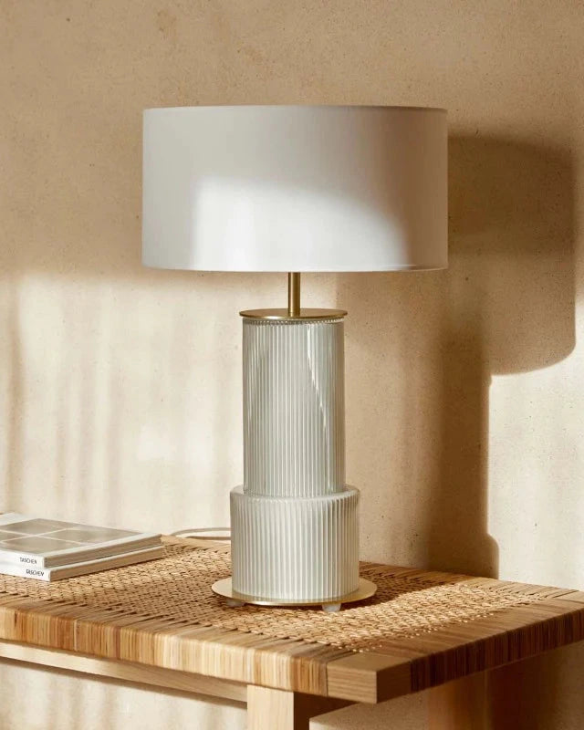 This mid-century-inspired table lamp is crafted from a combination of glass and steel topped with a fabric drum shade. Its tall glass base features stunning textural detailing finished in taupe. Available in two styles this lamp is designed to complement a variety of styled interior spaces. To be paired with an E27 globe (Not Included)