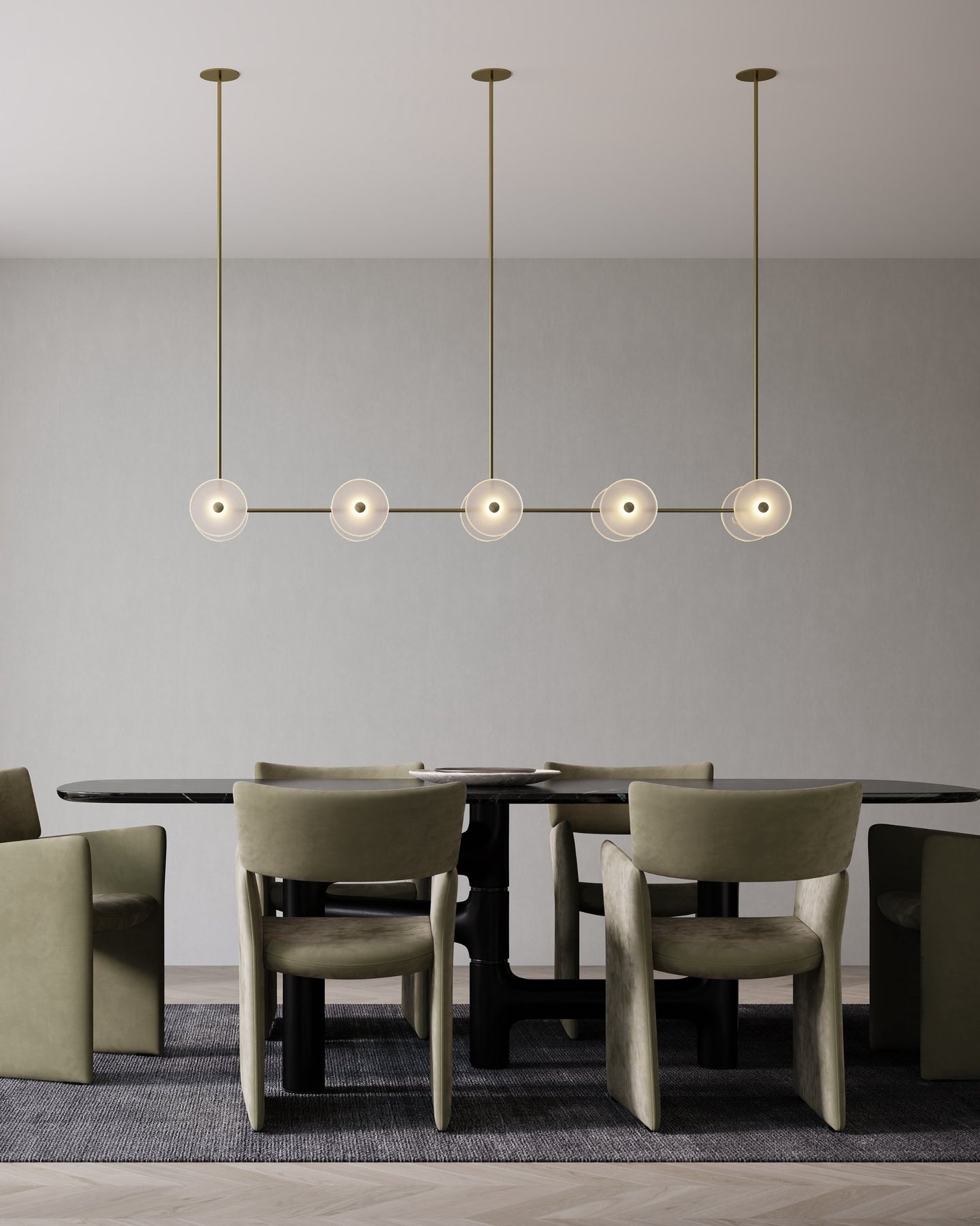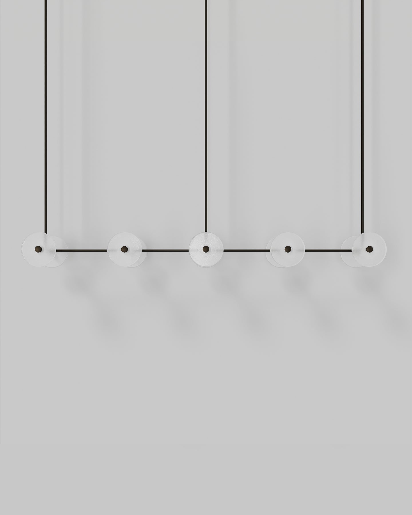 Handmade individually in Currumbin, Australia, this modern centrepiece is a perfect combination of geometry and elegance. Suspended over a kitchen island, a dining table or elevating an office space, this linear pendant features ten unique frosted or clear glass-blown discs suspended on a rod that is available in different finishes: brass, steel, matte black, matte white, or medium bronze powder coating. Easily blending in different interior spaces from classic to contemporary, this fixture will spread a pleasant soft light around and will radiate sophistication.