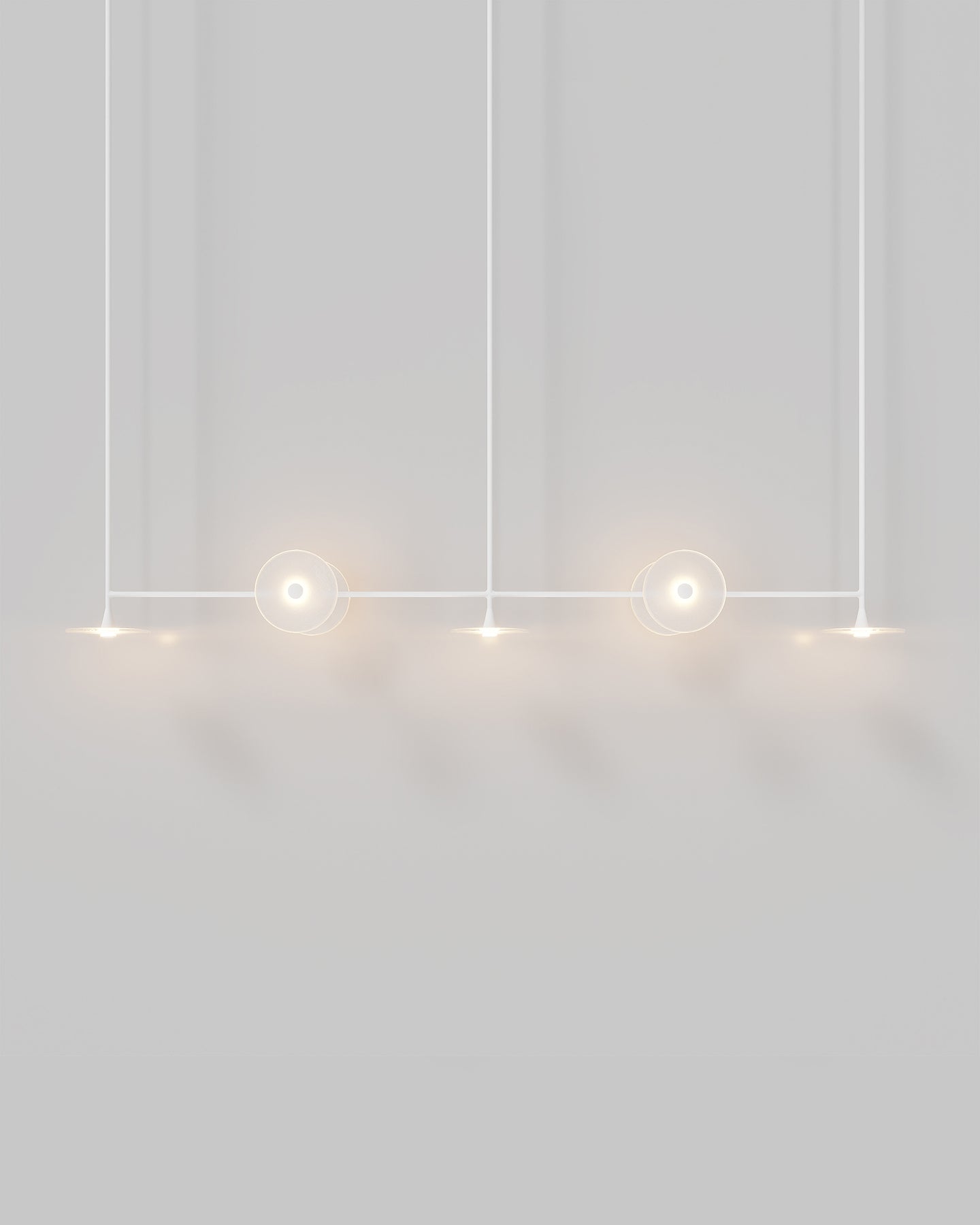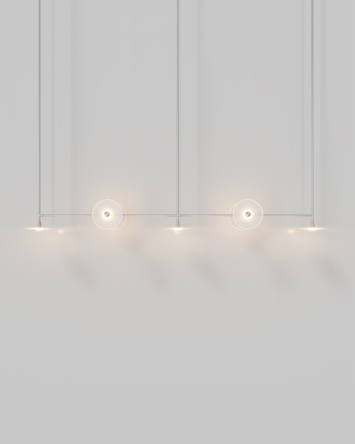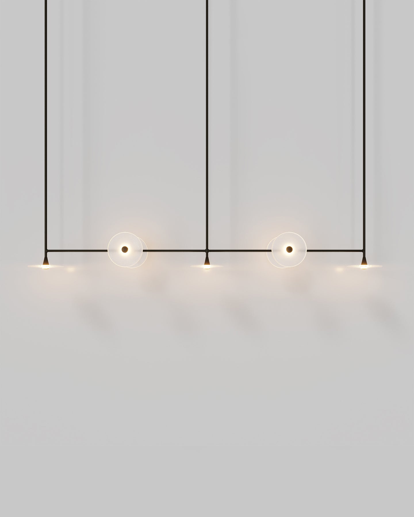 Individually crafted in Currumbin, Australia the Coral 7lt Linear Pendant is a focal centrepiece, intertwining functional lighting with design. Featuring 7 glass discs in a frosted or clear finish, with three facing downwards, and four facing perpendicular to the linear rod, this fitting is ideal for kitchen benches, islands or dining tables. Available in Brass, Matte Black, Matte White, Medium Bronze, or Steel, this is a versatile pendant that will blend into a variety of contemporary interiors.