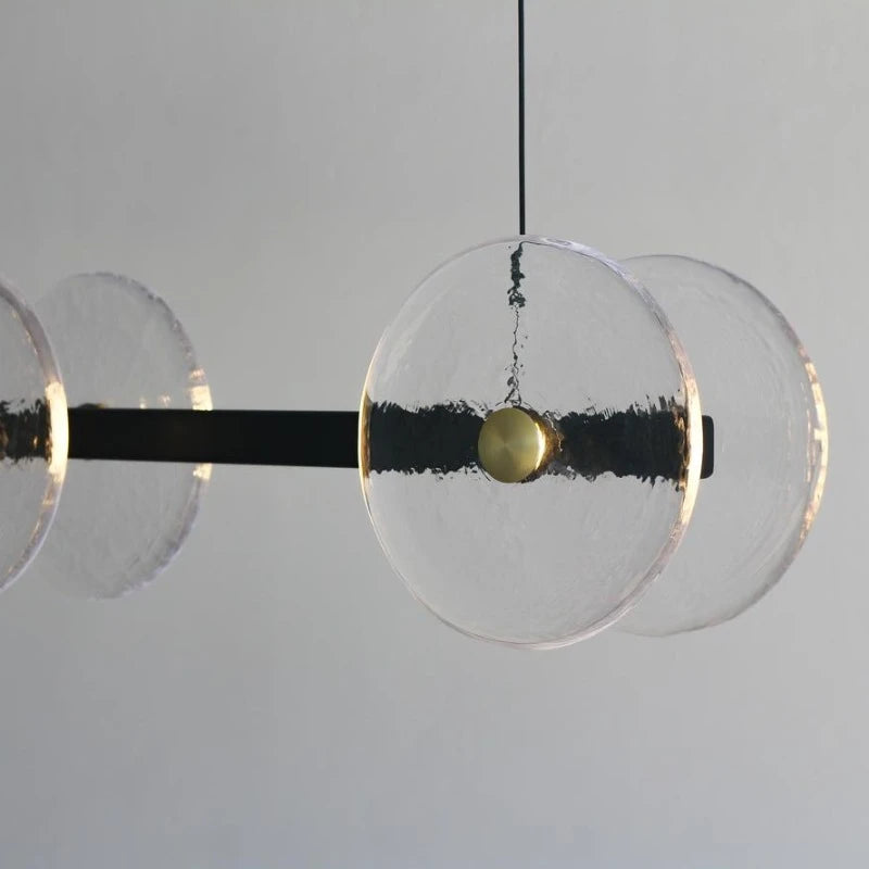 The Coral Linear Pendant boasts a distinctive and unconventional design aesthetic. It is carefully handcrafted to order in Currumbin, Australia, by Oliver Höglund and Ryan Roberts. Featuring ten transparent hand-blown glass discs suspended from a linear bar. Due to the artisanal production process, each pendant is unique and may display slight variations. Equipped with a driver and dedicated LED, this pendant is well-suited for illuminating a variety of settings, ranging from residential and commercial spaces to architectural constructions.