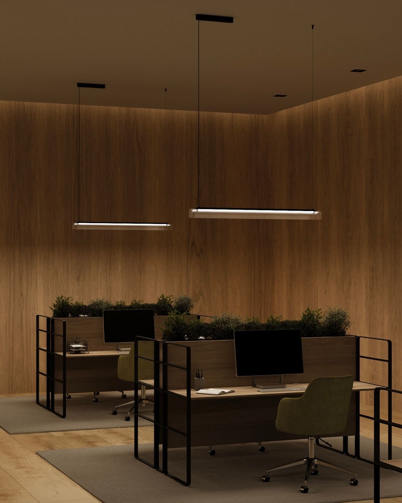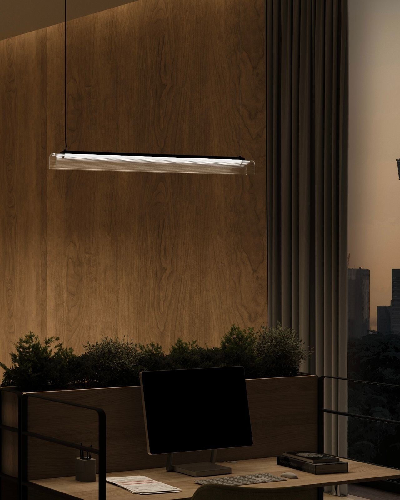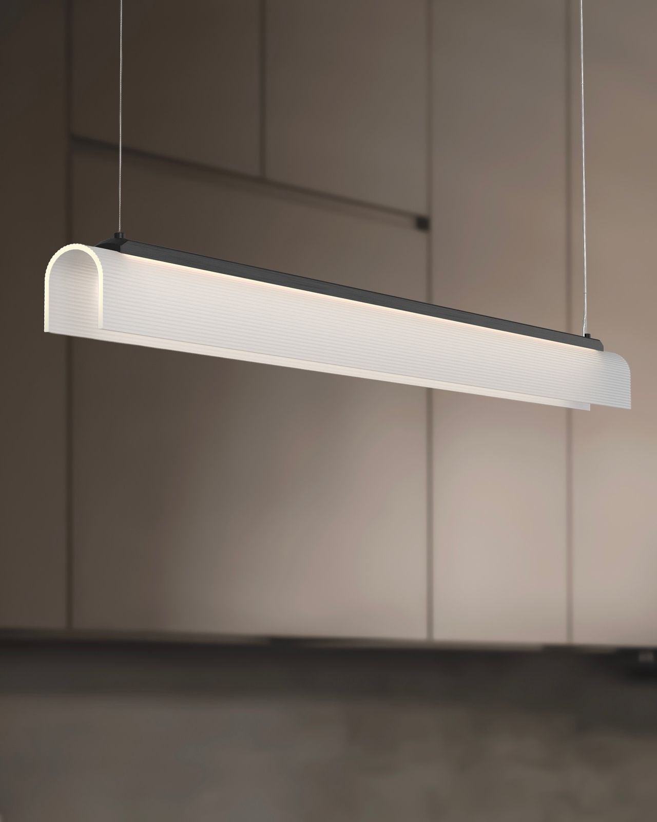 The Curved Glass Linear Pendant pairs a structured metal silhouette with a delicate, hand-slumped fluted glass shade. Available in Old Brass or Iron finishes, with a ribbed borosilicate glass shade in clear or frosted options, the design introduces subtle texture and depth while maintaining a minimalist profile. Ideal for long dining tables, kitchen islands, or commercial applications, this pendant delivers even, directional illumination with a sleek, linear aesthetic, making it a versatile solution for both residential and professional interiors.