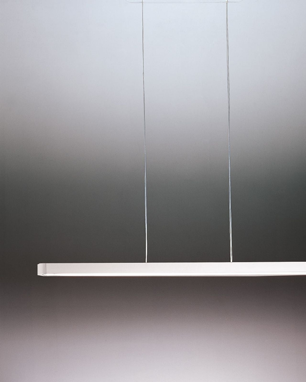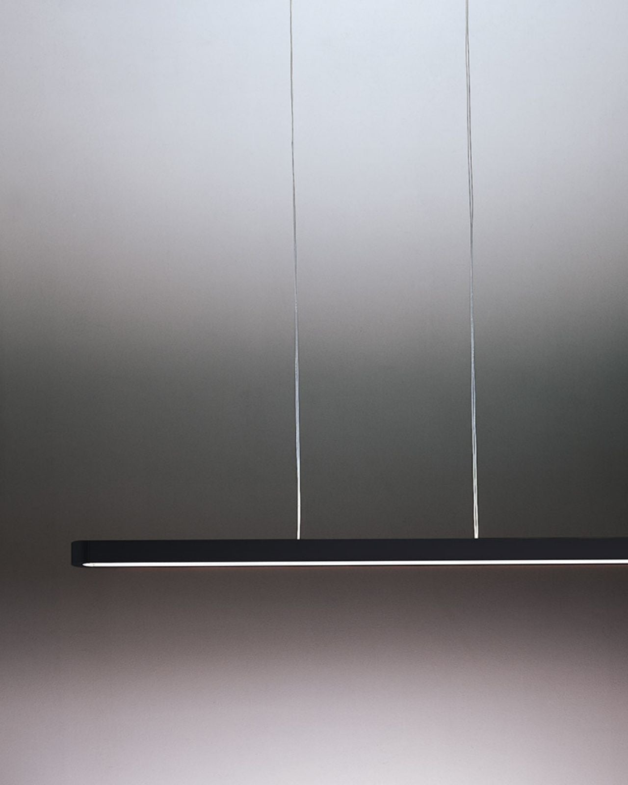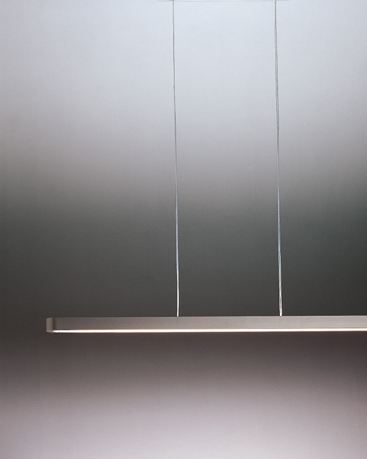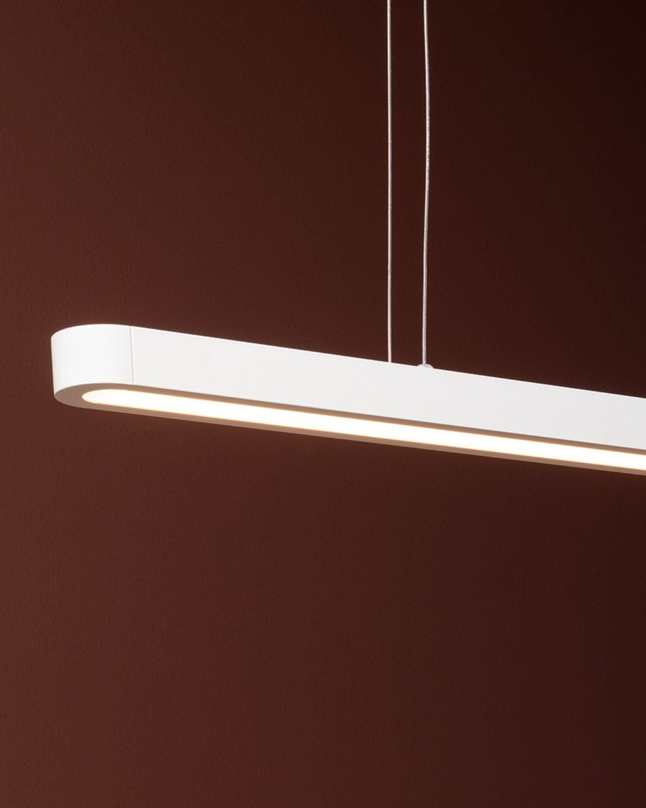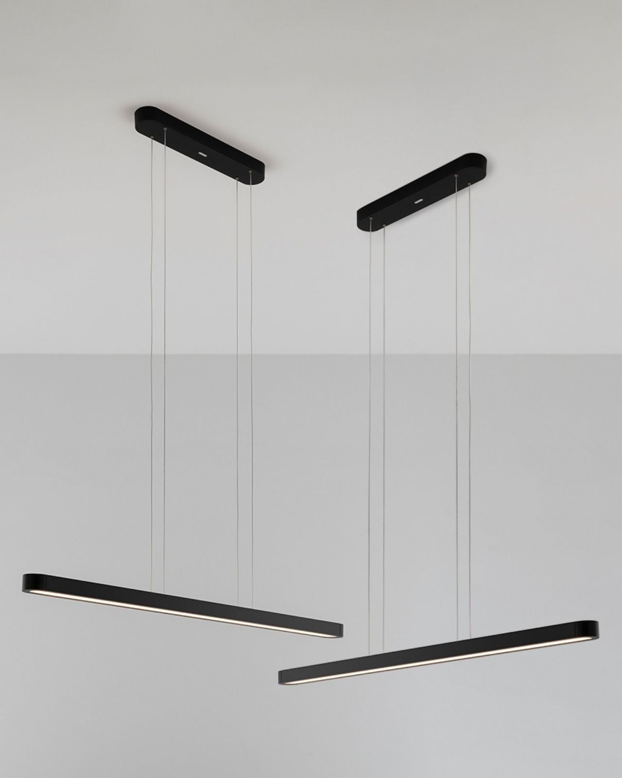 The Rounded Cylindrical Linear Pendant is crafted from painted extruded aluminium with cast-aluminium end caps, floating effortlessly from the ceiling on slender suspension cables. The smooth, matte finishes, available in silver, white, or black, emphasise a delicate balance of materials, lending a sense of lightness and grace. When illuminated, the pendant emits a warm, evenly diffused glow through its opaline polycarbonate diffuser, softening edges and creating an inviting ambience, ideal for above a dining table, kitchen island, or contemporary workspace.