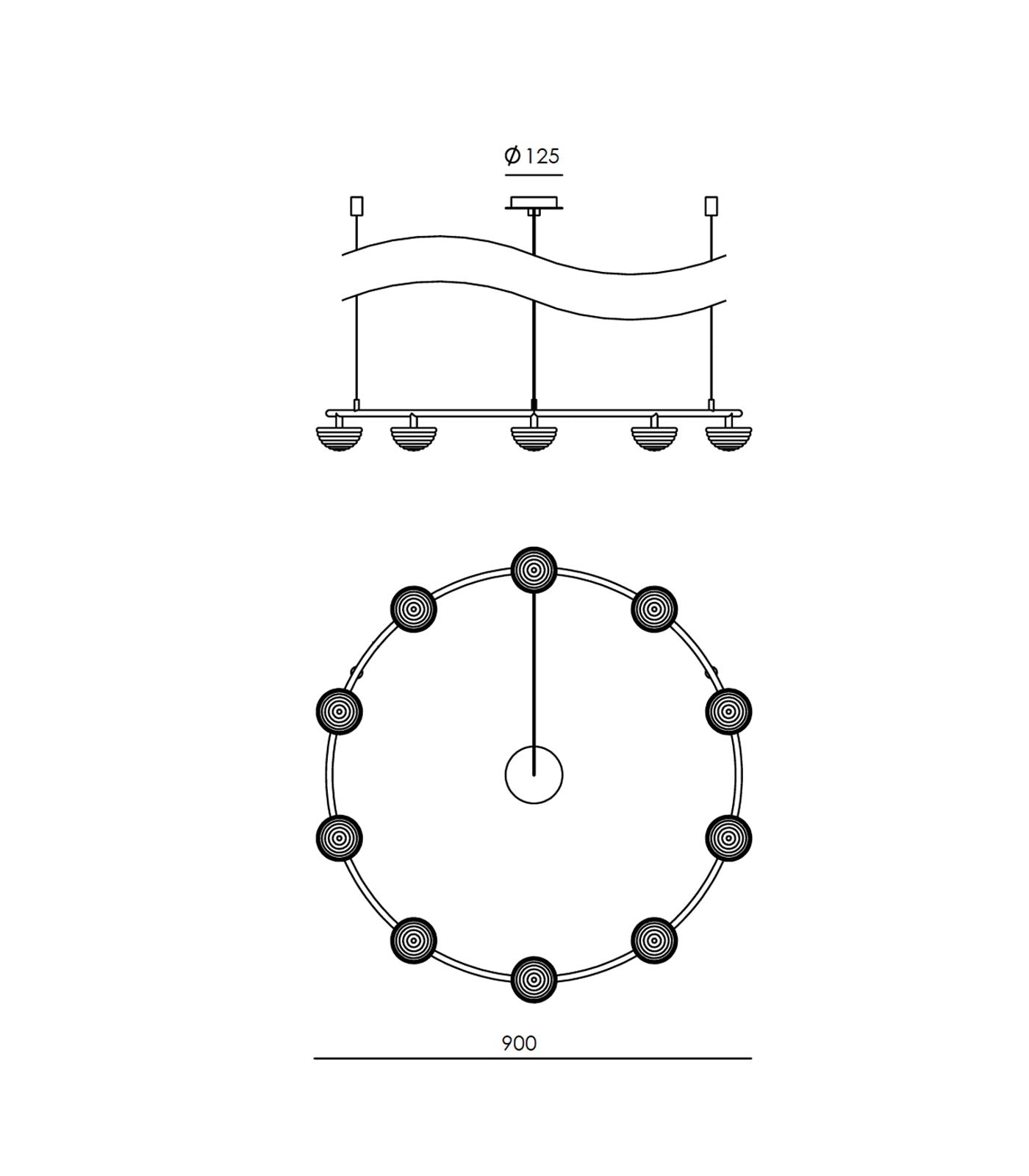 The Rippled Glass Shade Chandelier, designed by Pepe Fornas, features dome-like, lined glass shades reminiscent of the optic rhythm seen in water ripples. Its slim metal structure extends gracefully, holding the softly curved shades in place, creating a sense of lightness and balance. The combination of clean lines and smooth, rounded forms gives it a refined, contemporary aesthetic. create a whole new description and change the name to Rippled Glass Shade Chandelier
