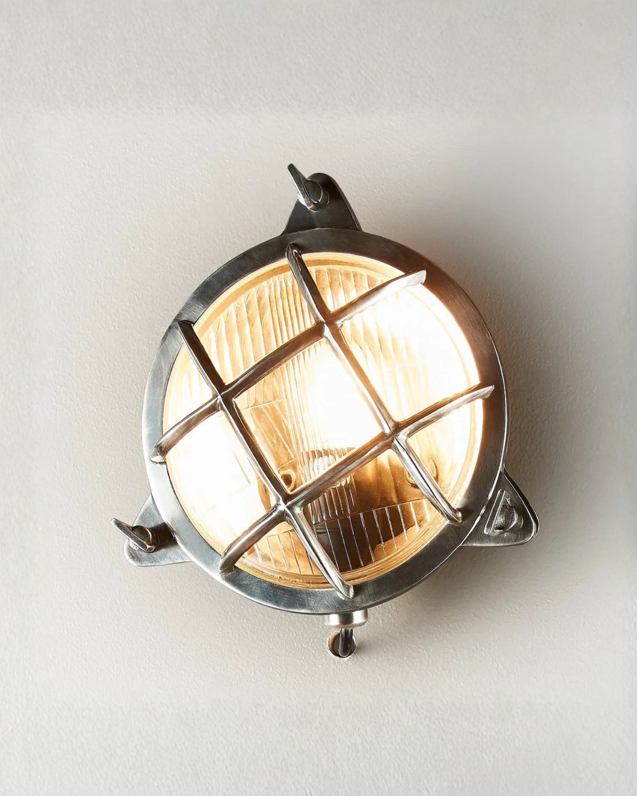 This industrial-style exterior wall light is expertly cast in solid brass and is available in either a nickel-coated or natural brass finish, bringing a subtle vintage and nautical character to any outdoor space. Ideal for mounting on entrance pillars, along exterior pathways, or throughout the garden, it provides both functional illumination and a distinctive design feature.