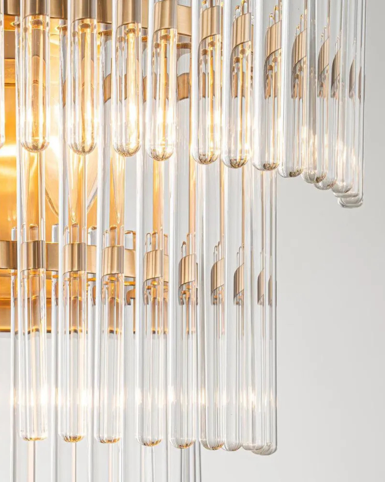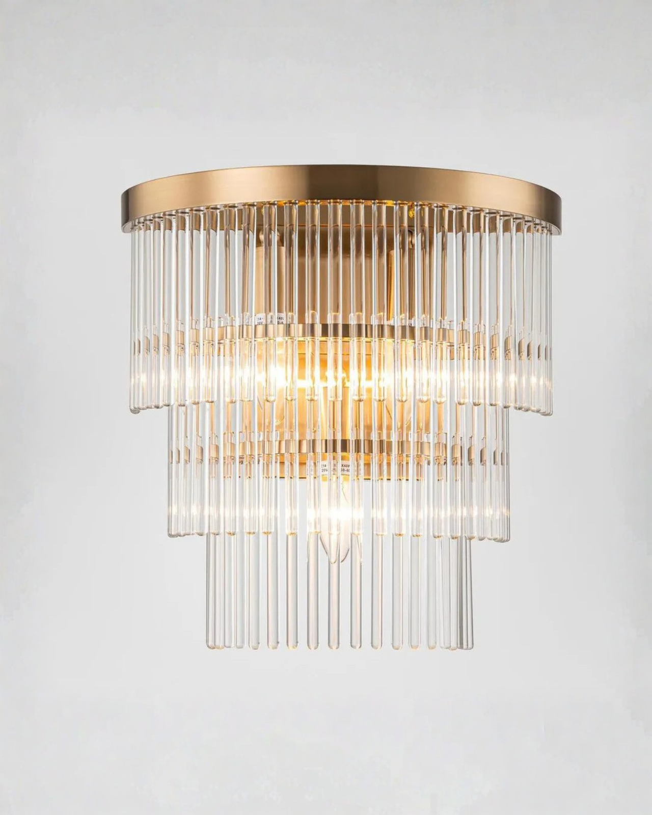 Suspended within a triple-layered semi-circular iron frame finished in sleek brass, the glass cylinders are presented with refined clarity. This striking wall light introduces a subtle decorative presence to living spaces or hallways, balancing modern and classic influences while casting a warm, inviting glow.