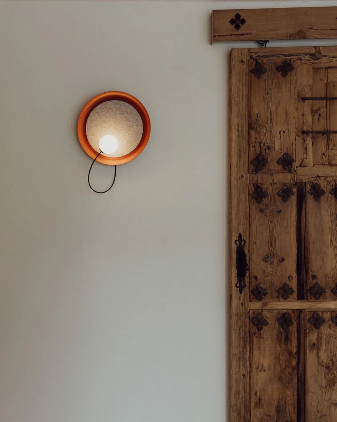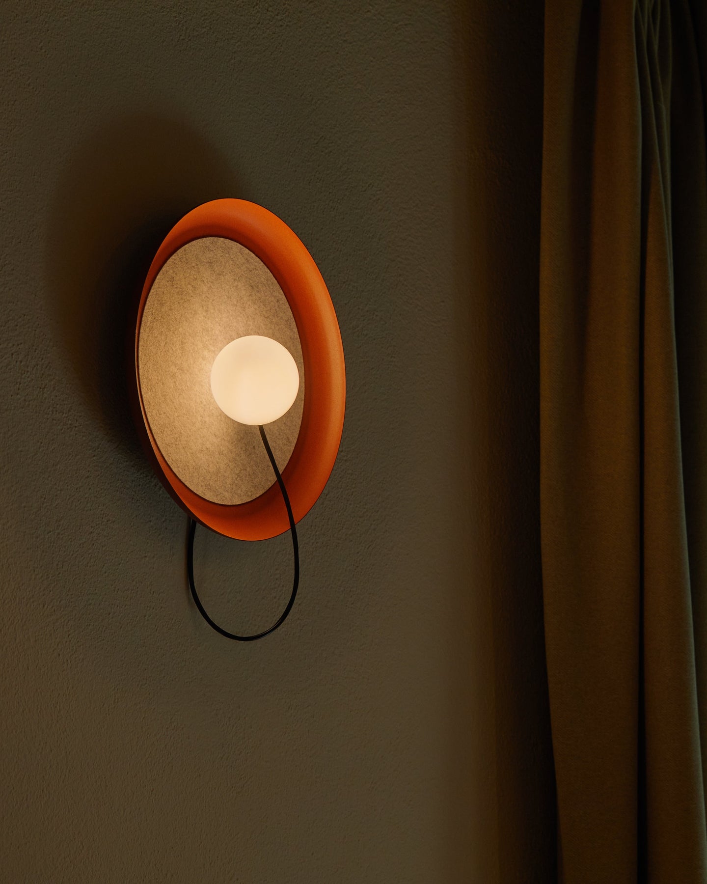 Wall-mounted lamp with orange frame and white bulb on a neutral wall.