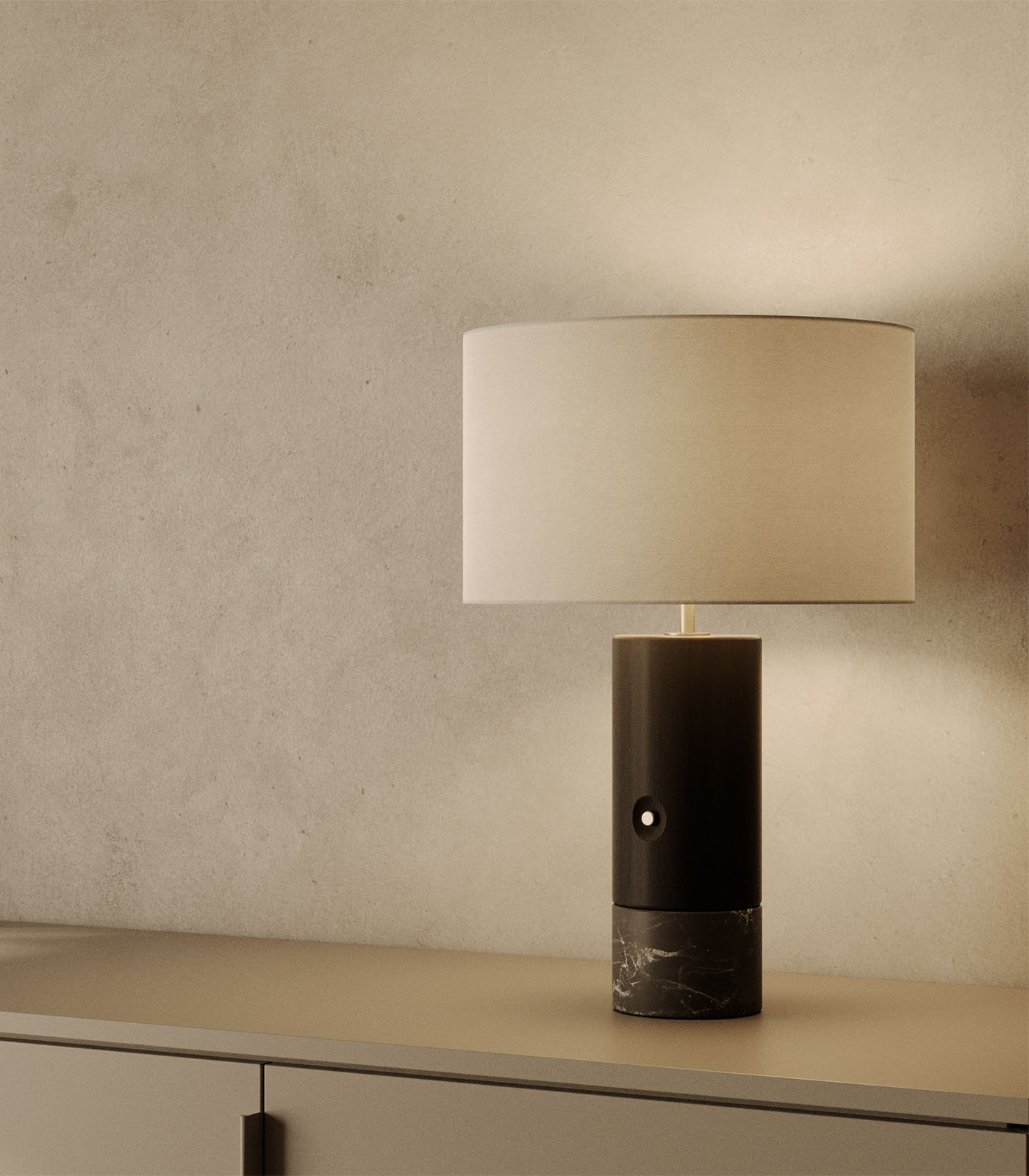 The Marble & Wood Table Lamp fuses minimalism and elegance, designed to enhance contemporary interiors with its clean lines and refined materials. The cylindrical body is grounded by a solid marble base, while a soft fabric drum shade diffuses warm, ambient light, ideal for sleek interior spaces. Available in a range of sophisticated finishes, from dark marble to warm natural tones, this fitting adapts effortlessly to a variety of interior styles. Whether placed in a moody, modern setting or a bright, organic-inspired room, it brings a harmonious balance of texture and tone.