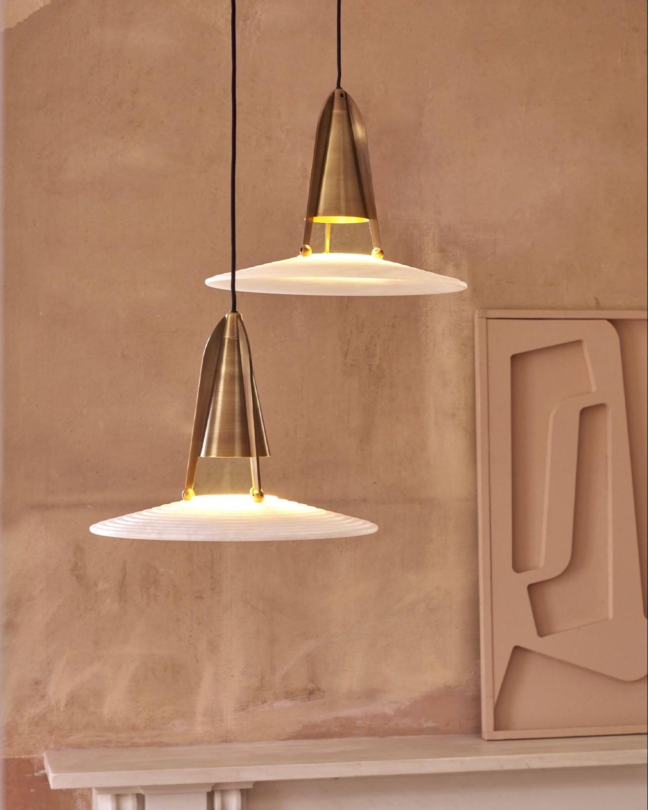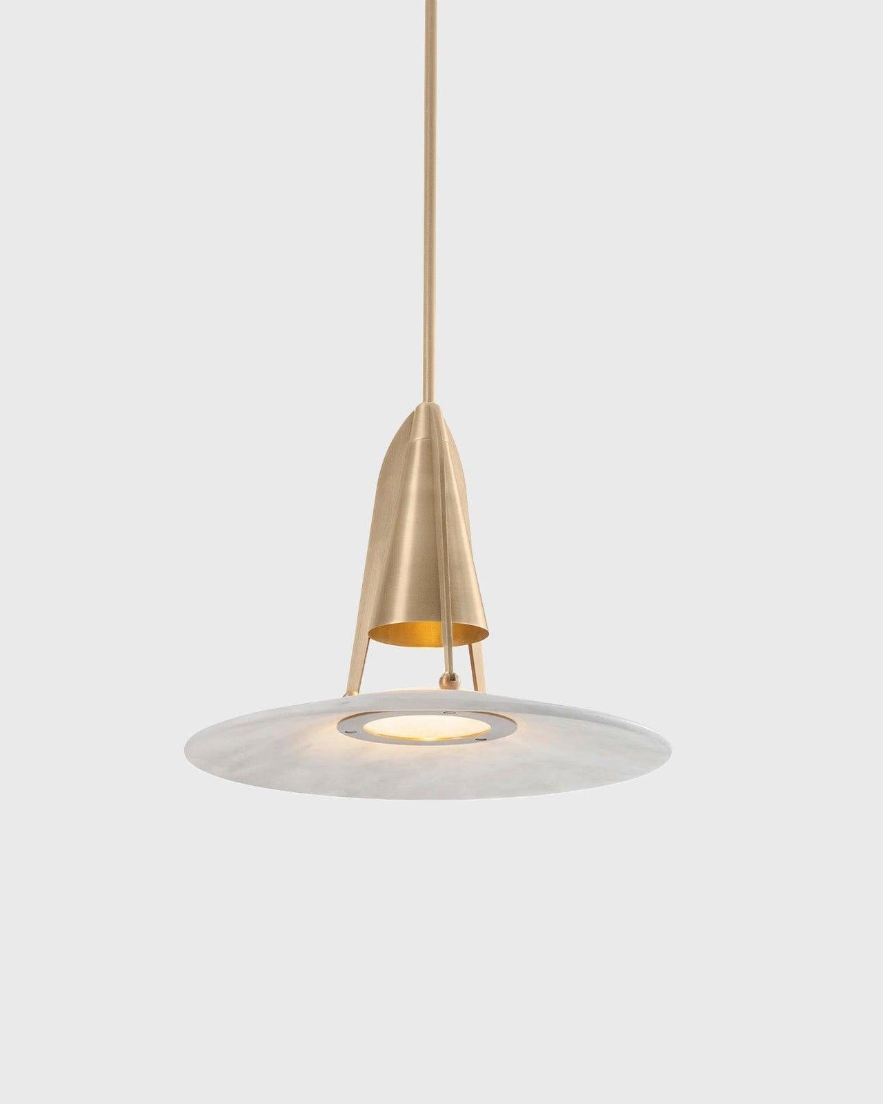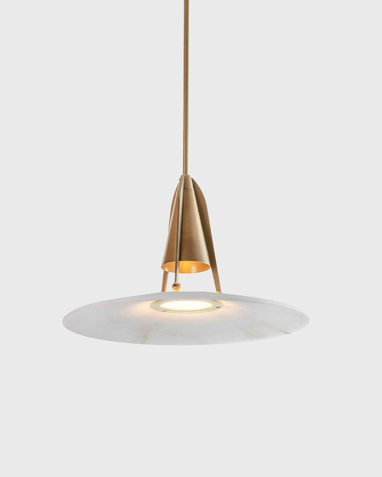 Illuminating with a soft, diffused glow, this Mid-Century–inspired pendant pairs translucent alabaster with finely crafted brass detailing. The natural stone, sourced from Spain, reveals its reflective character through a contoured disc form, balanced by a sculpted conical structure handmade in England.