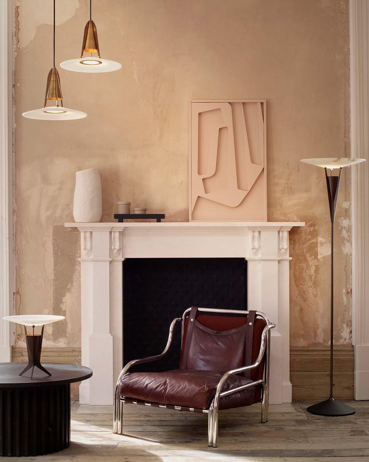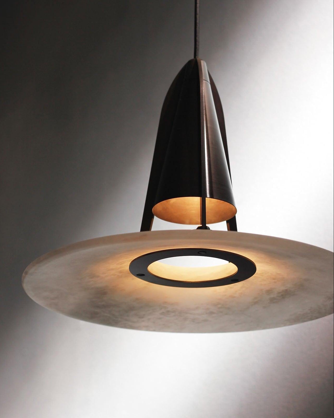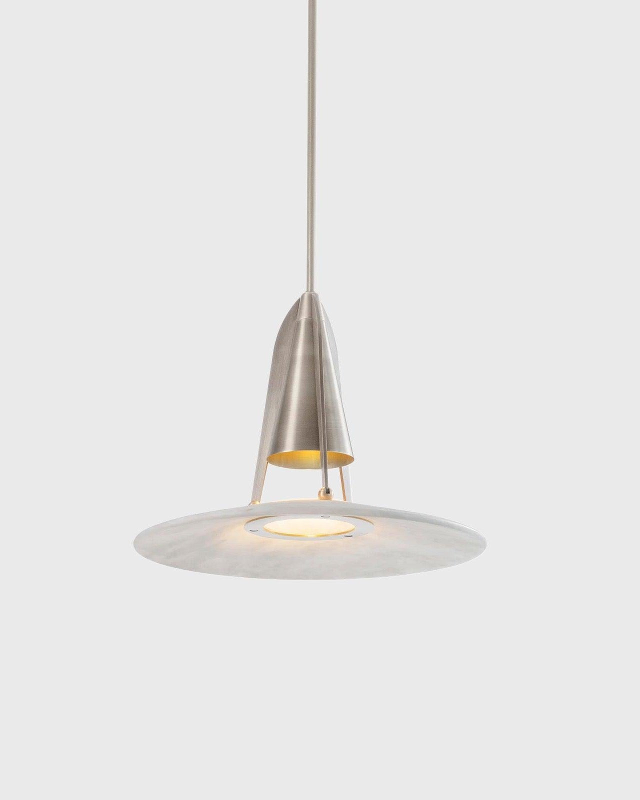 Available in two sizes and finished in antique brass, bronze, satin brass, or satin nickel, this pendant highlights the qualities of its materials through clean, considered geometry. Its warm illumination and distinctive design make it suited to spaces seeking high-quality materials, minimal forms, and a calm, understated focal point.