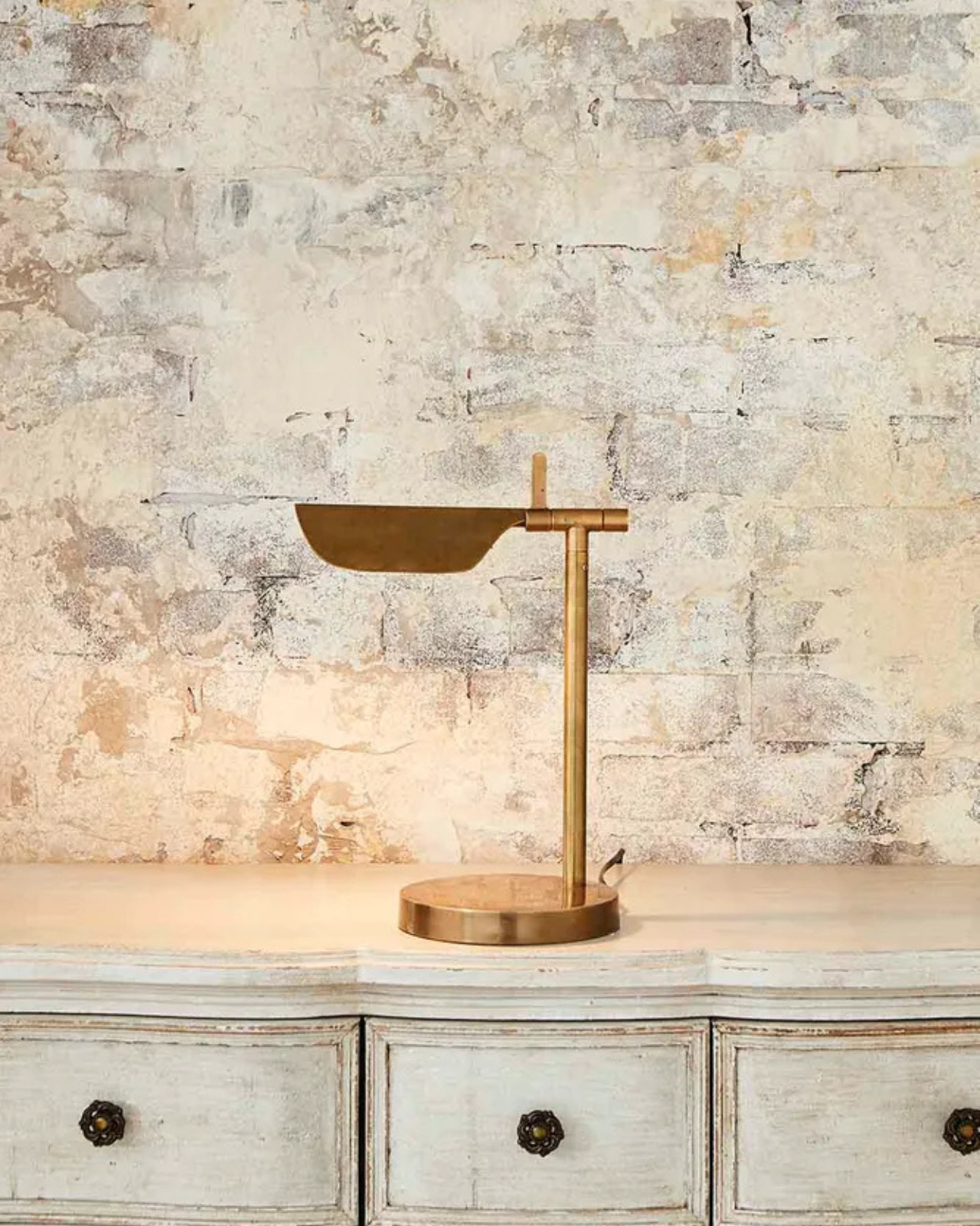 Geometric shapes cast in a solid antique brass finish form a modern desk lamp that’s both sculptural and functional. Designed with precision, this piece offers a warm metallic depth that complements contemporary and mid-century interiors alike. Perfect for home offices, bedside tables or creative spaces, the lamp provides directional light while serving as an eye-catching design feature. Crafted from durable materials, it balances artistry and practicality.