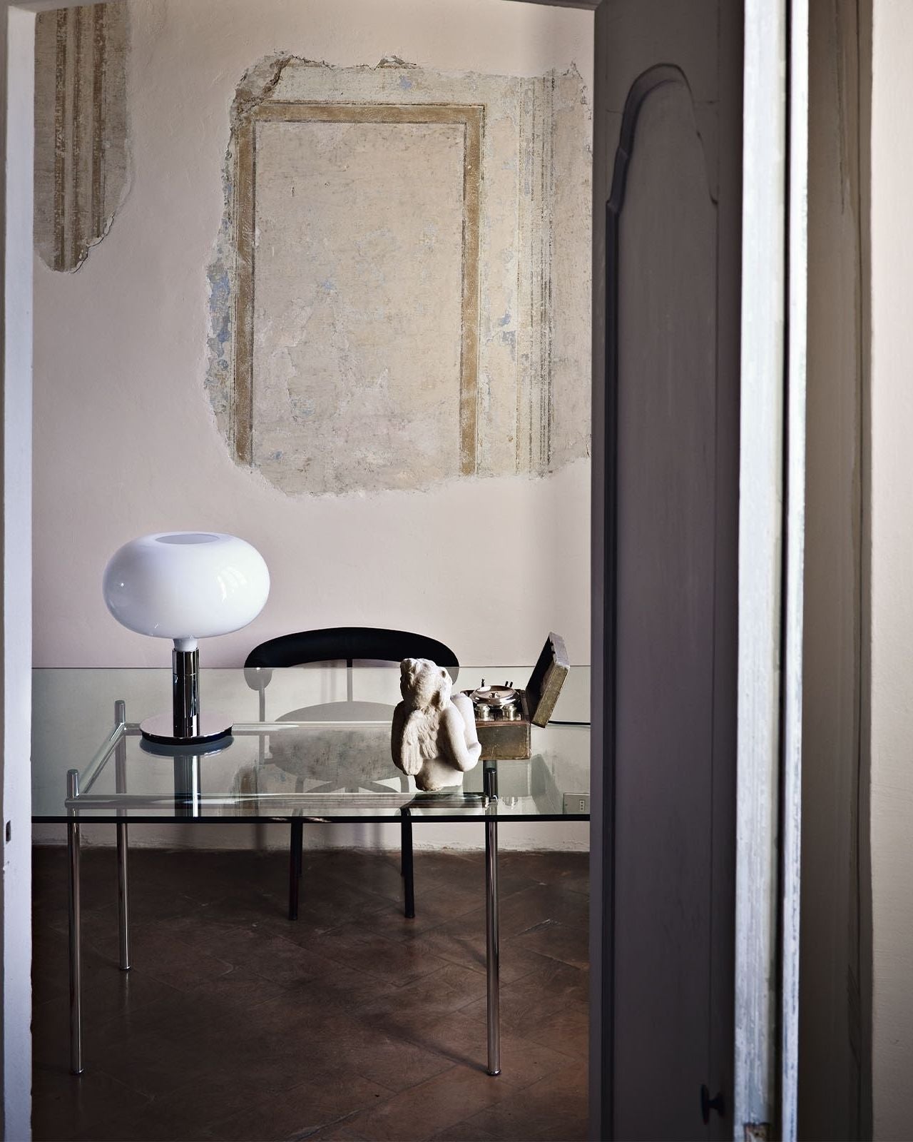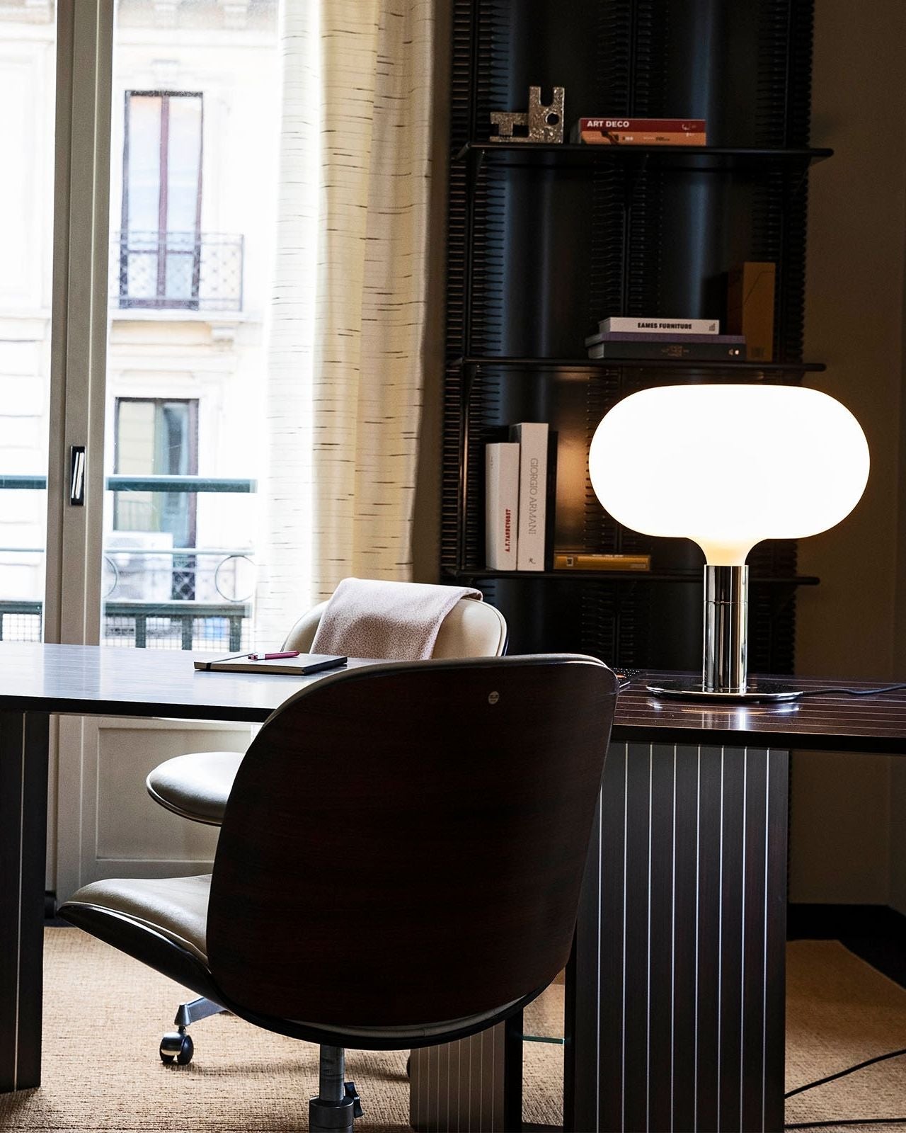 Fixed on a sleek structure, the captivating oval shade will make a statement in modern, contemporary or mid-century modern interiors. Made from metal and hand-blown glass with a glossy opal white finish, this diffuser will cast a soft and glare-free light in reading nooks, offices, study rooms, living rooms or bedrooms. Designed by Franco Albini, Franca Helg and Antonio Piva, this a true testament to mid-1960s lamps combining quality materials and linear shapes.