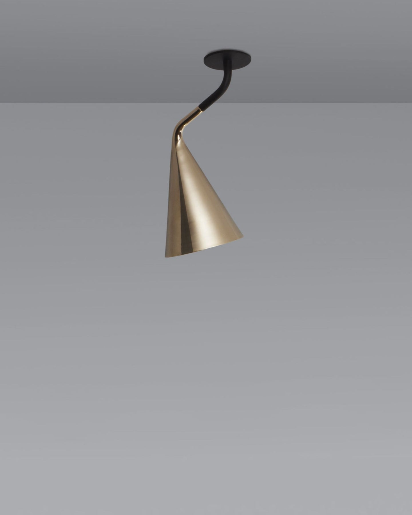 Available in black chrome, brass or a matte black finish, the conical modern shade is mounted on a black powder-coated short-angled arm. Providing downward light, this fixture looks great on its own or in a line. Ideal for kitchens, living rooms or dining rooms, it will perfectly adapt to any interior style, from contemporary to traditional, bringing an elegant and refined touch.