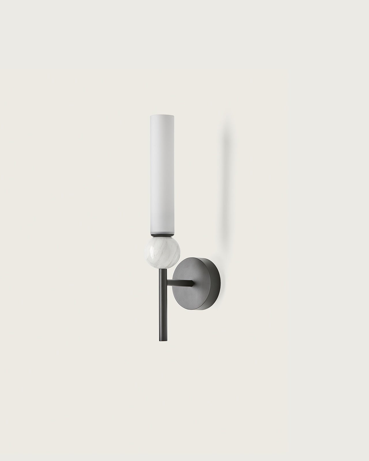 Crafted from a combination of marble, metal, and glass this wall light has been designed to be an understated focal point within any interior. Its tubular form is topped with an opal shade which appears to balance on the spherical marble accent of the fitting and houses a G9 LED. Providing a soft warm glow this minimalist design is suited for residential and commercial interiors. Available in Old Gold and Black Marble or Matte Black and White Marble this wall light has been designed to suit a range of styled spaces.