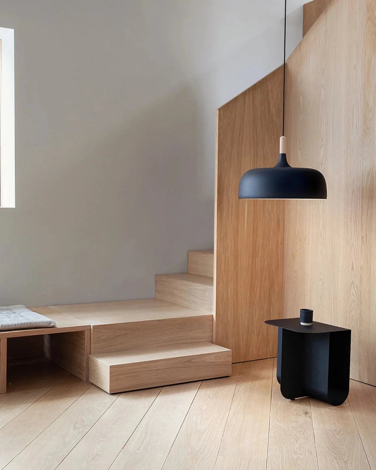 Modern interior with wooden stairs, black pendant lamp, and side table.