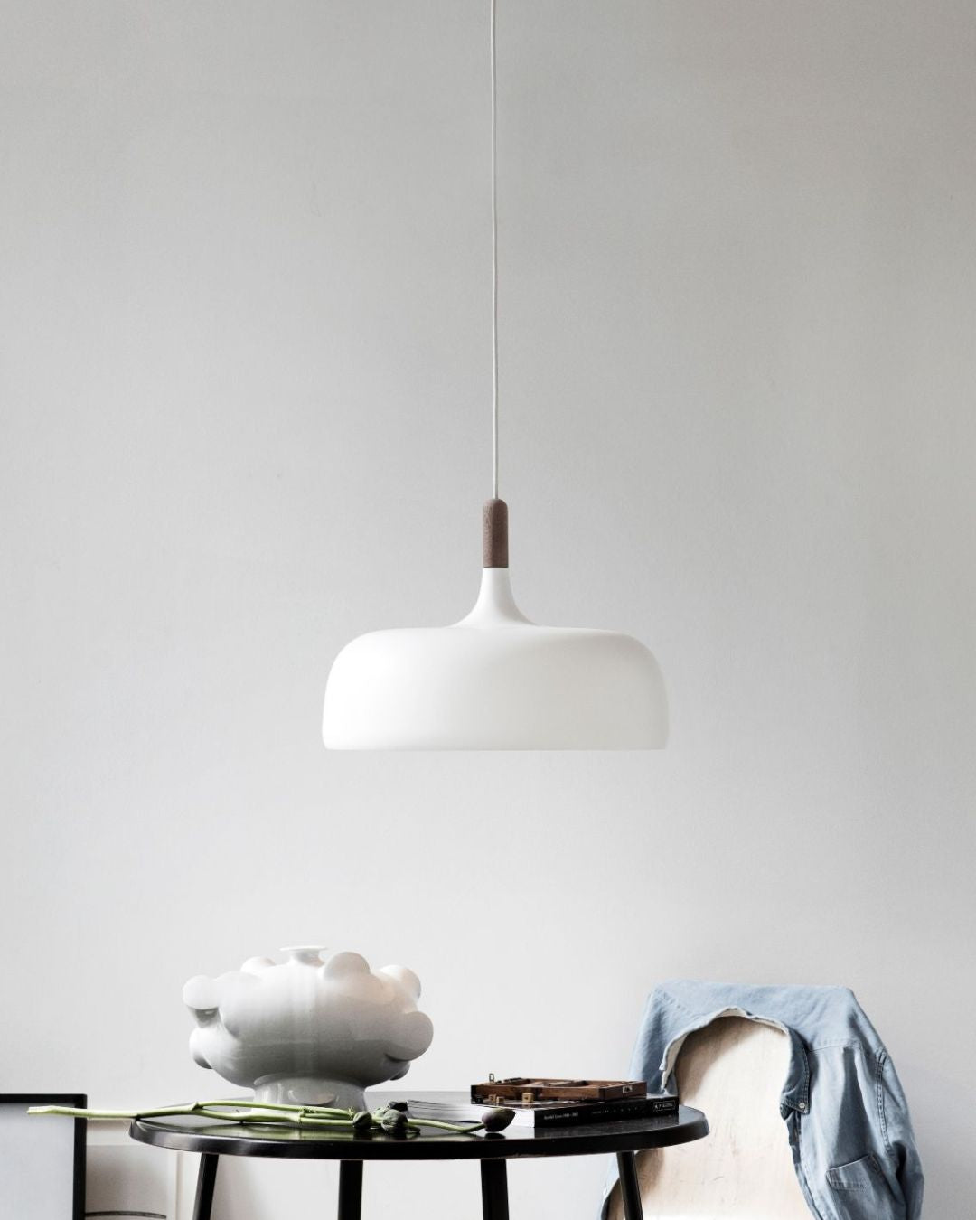 White pendant lamp hanging above a table with a minimalistic interior setting.