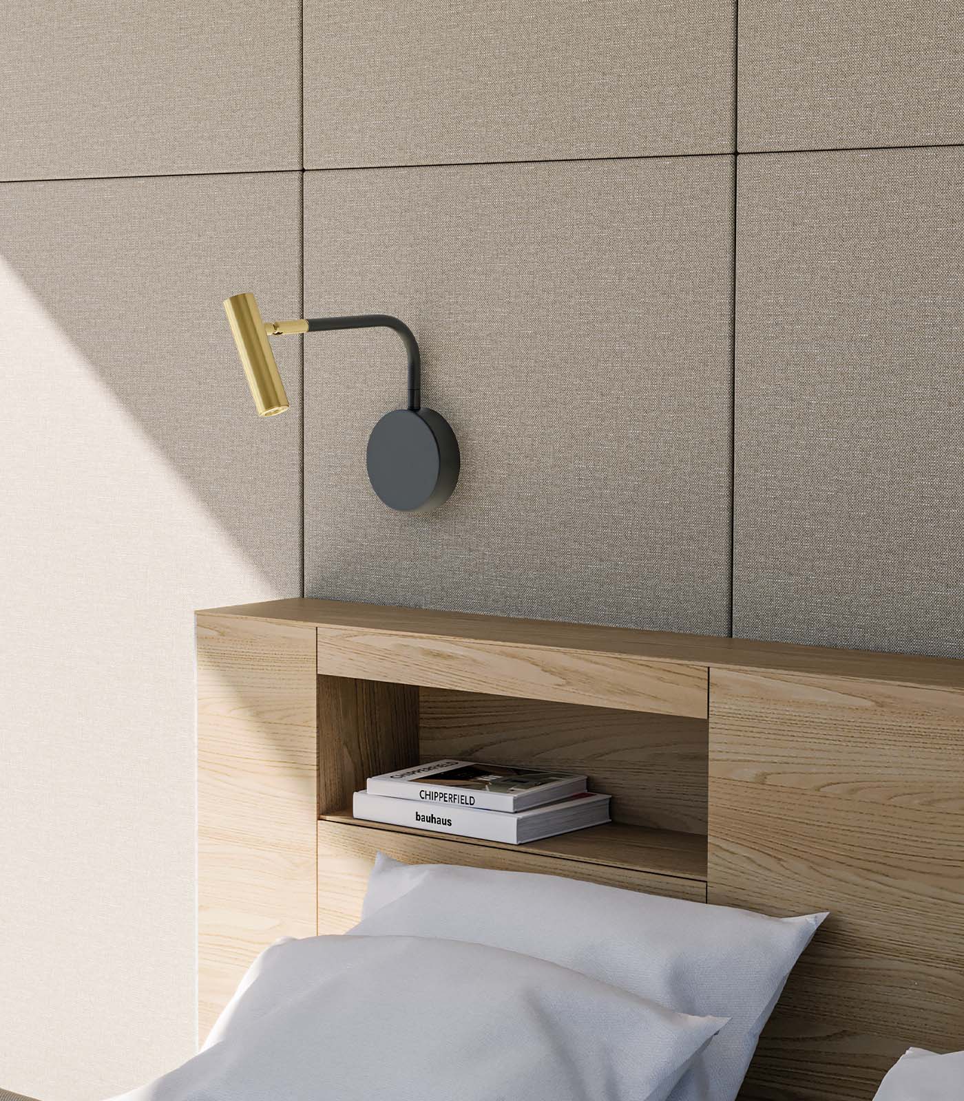 The Contemporary Matte Black Spotlight is designed to provide a direct light suited for use as a reading, bedside or desk light. This sleek wall light provides high-functionality with its touch dimmable feature and adjustable shade. Provided with an integrated COB LED 5W 3000K light source. Made from steel this modern design is available in complete Matte Black or Matte Black with a Matte Brass shade.