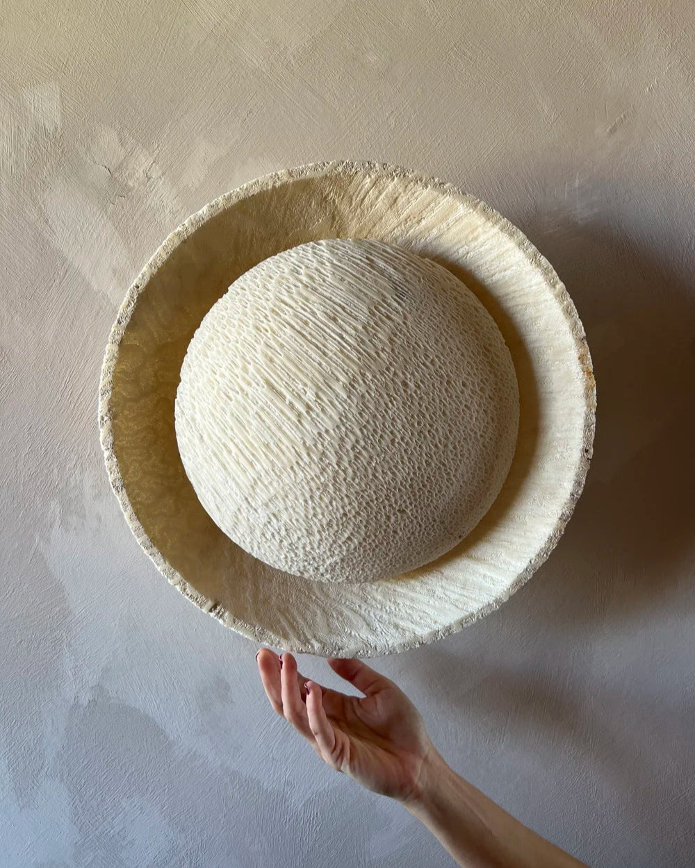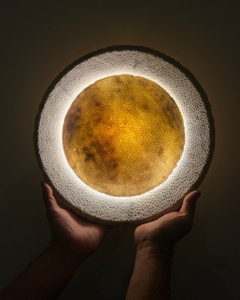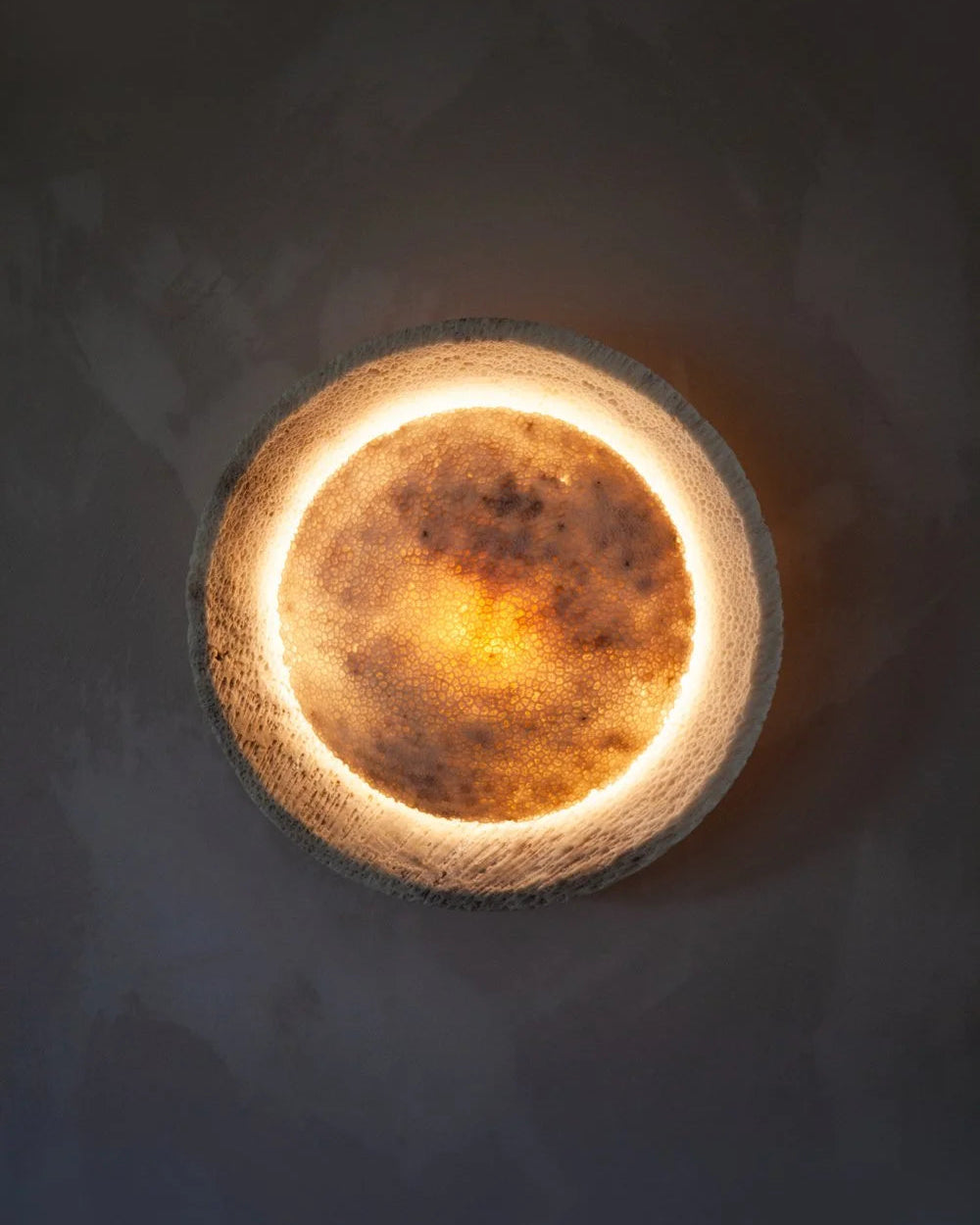 Fossil Coral Circular Wall Sconce On Front hands