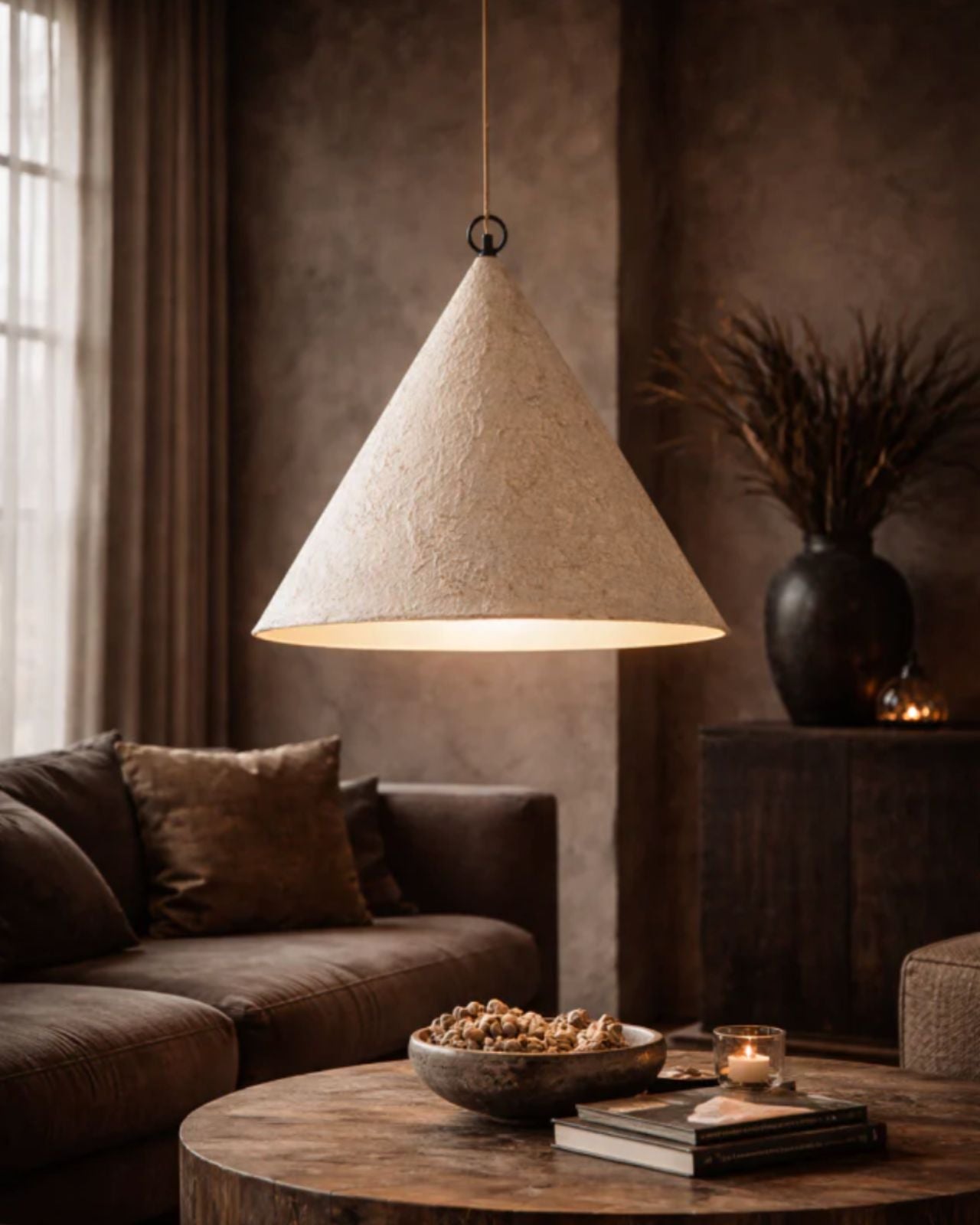 By Uniqwa Collections, the Handcrafted Paper Mache Pendant | Khufu is a statement piece that celebrates natural artistry and raw craftsmanship. Handcrafted from paper-mâché, each pendant is entirely unique, with subtle variations in texture, natural cracks, and organic imperfections that showcase the beauty of its artisanal creation.