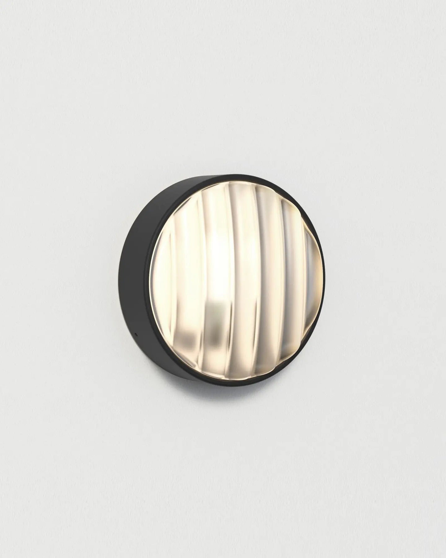 This bunker-style light showcases a modern industrial design. Paired with a sand-blasted wide-ribbed glass diffuser and finished in a textured black, this wall light is ideal for illuminating exterior pathways, garage walls or outdoor entertainment areas. Available in a 220mm and 300mm diameter option.
