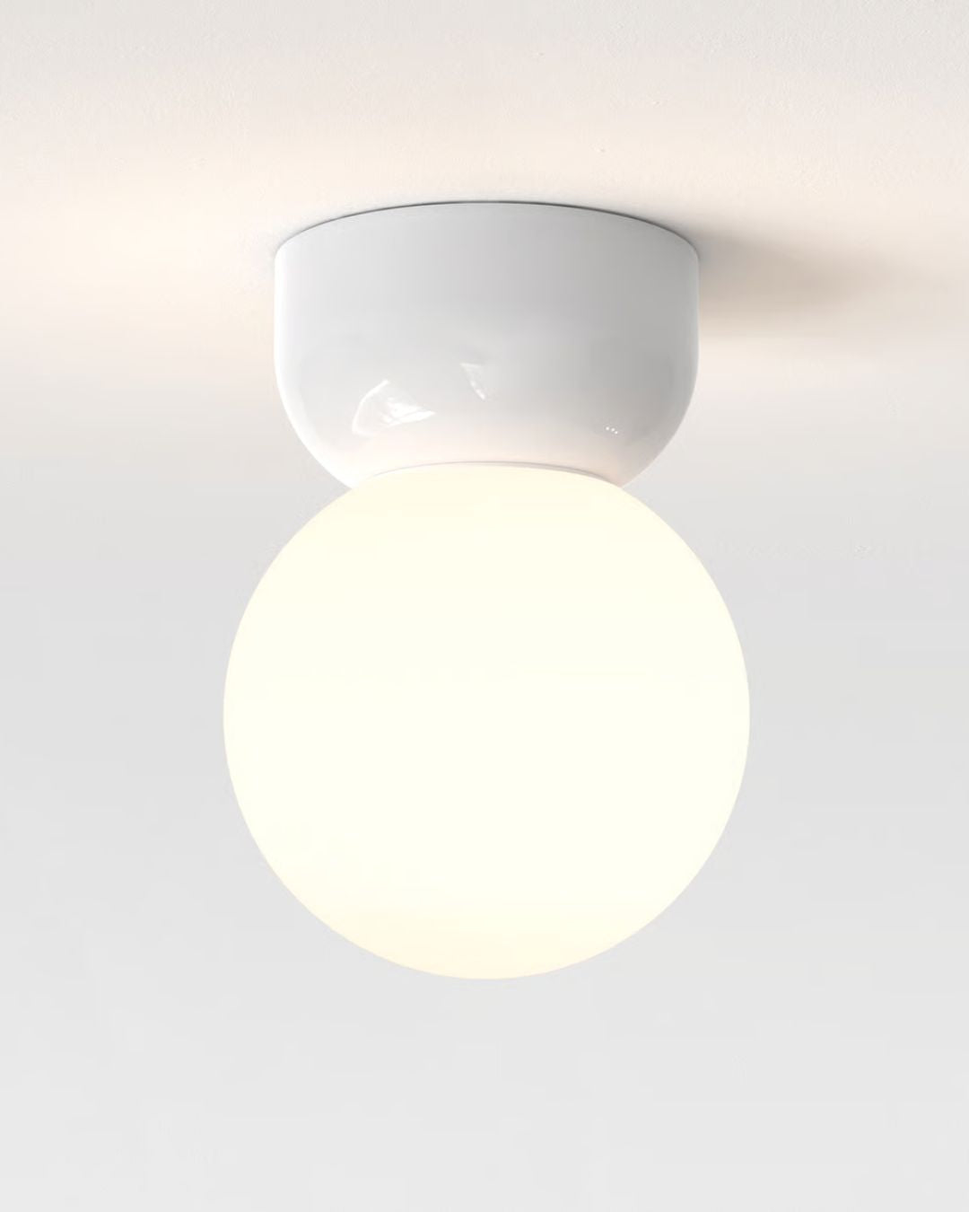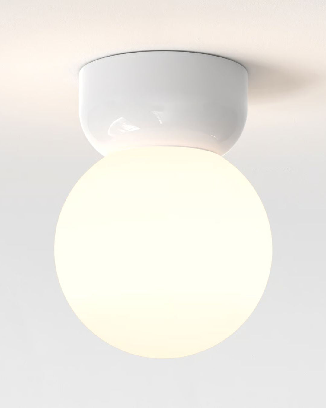 Simple yet elegant, this ceiling light features a white ceramic base and a glossy orb-shaped shade to enhance any modern space. Available in two sizes and featured with an IP44 rating, this fixture will lighten up bathrooms and hallway spaces. The glare-free light produced by this modern design will evoke a comfortable and cosy atmosphere.