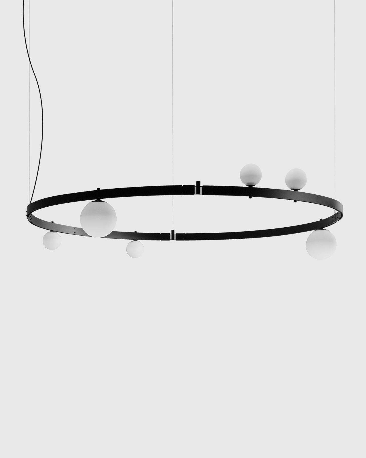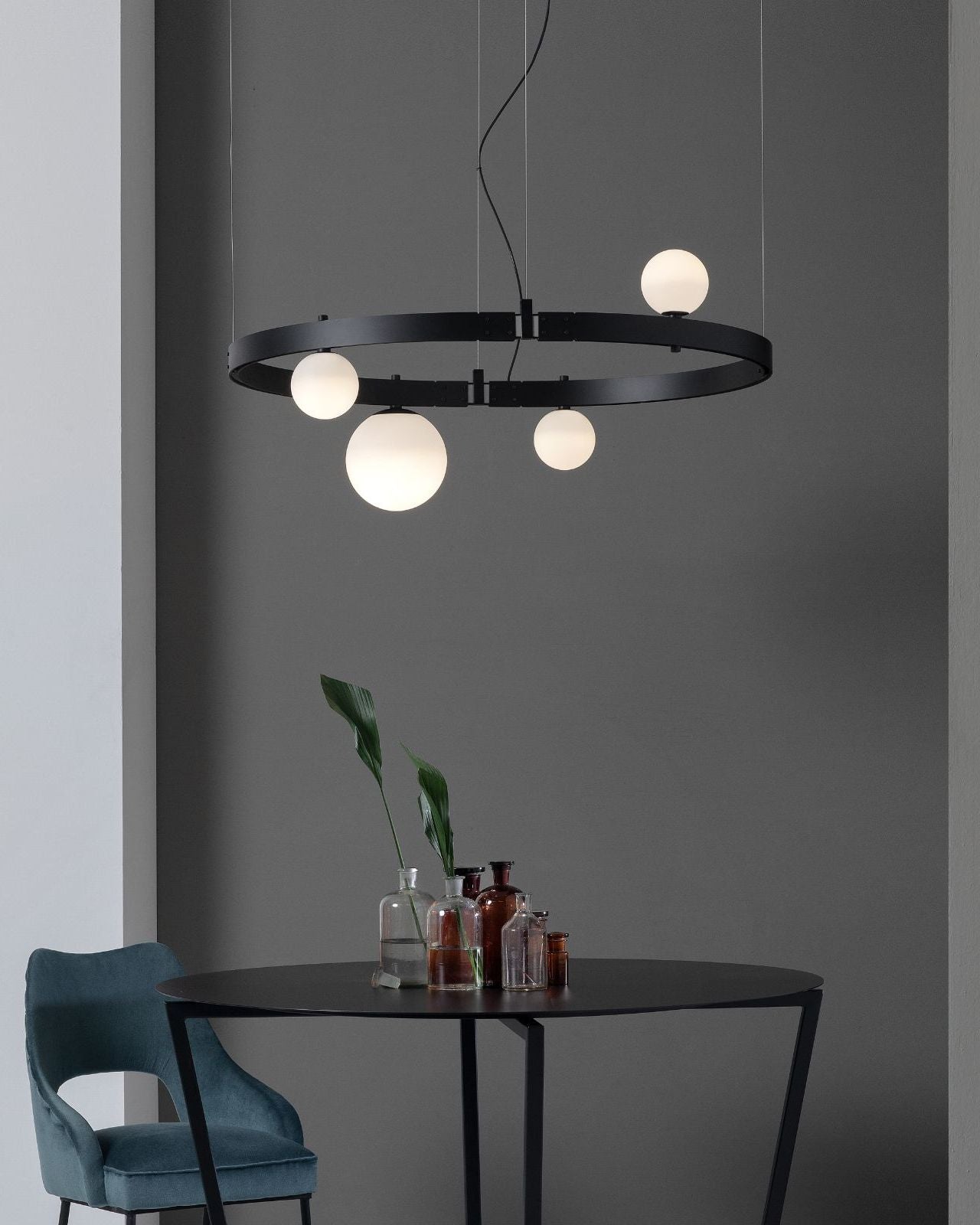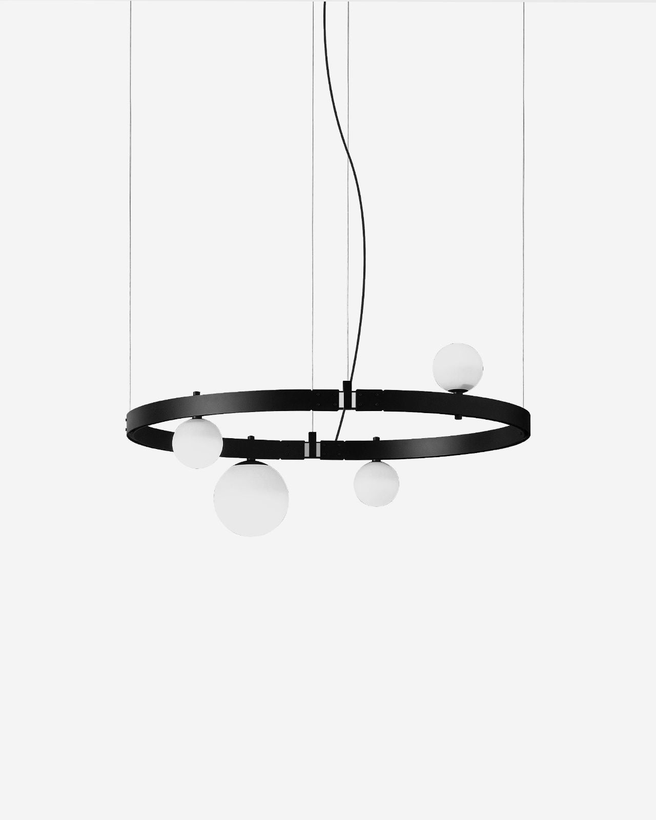 Using the inspiration from geometric shapes, lines and circles, this circular pendant light evokes a sense of drama and modernity. Available in black rings, with four or six orb lights balancing around the Aluminium frame. This light is the perfect Void Filler.