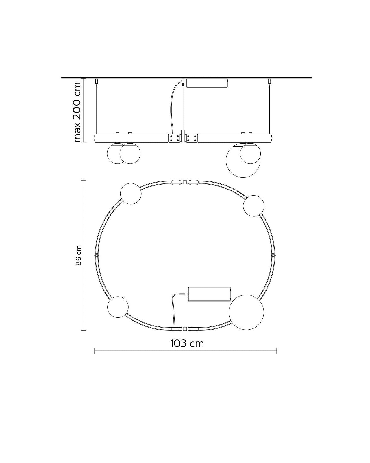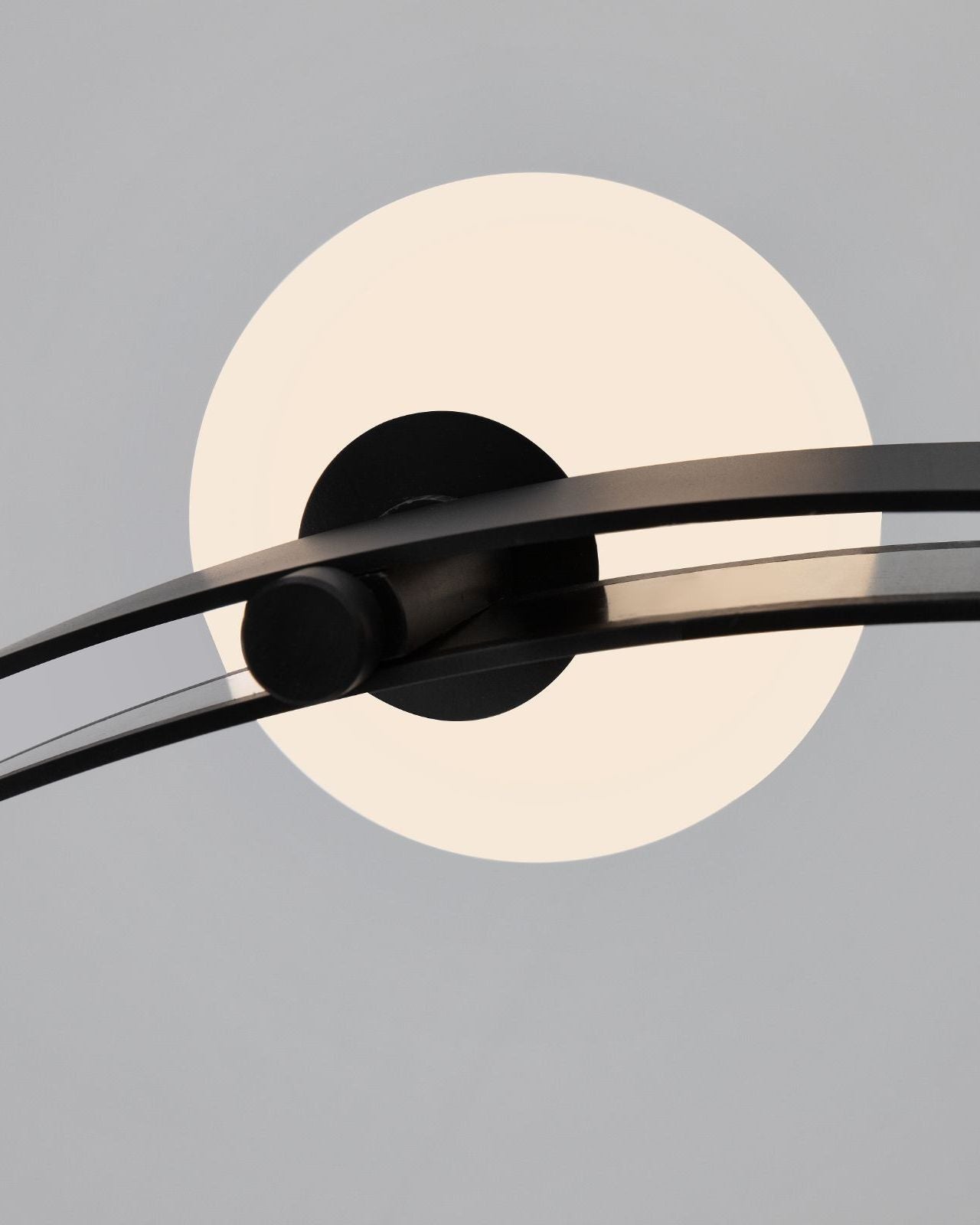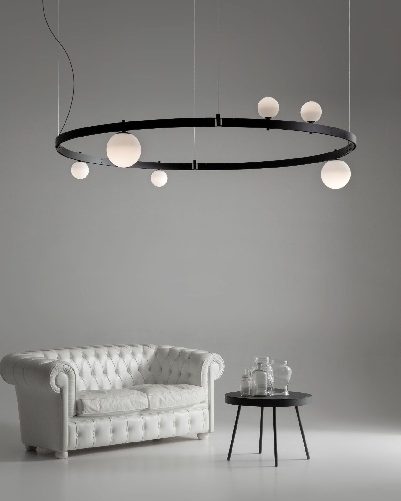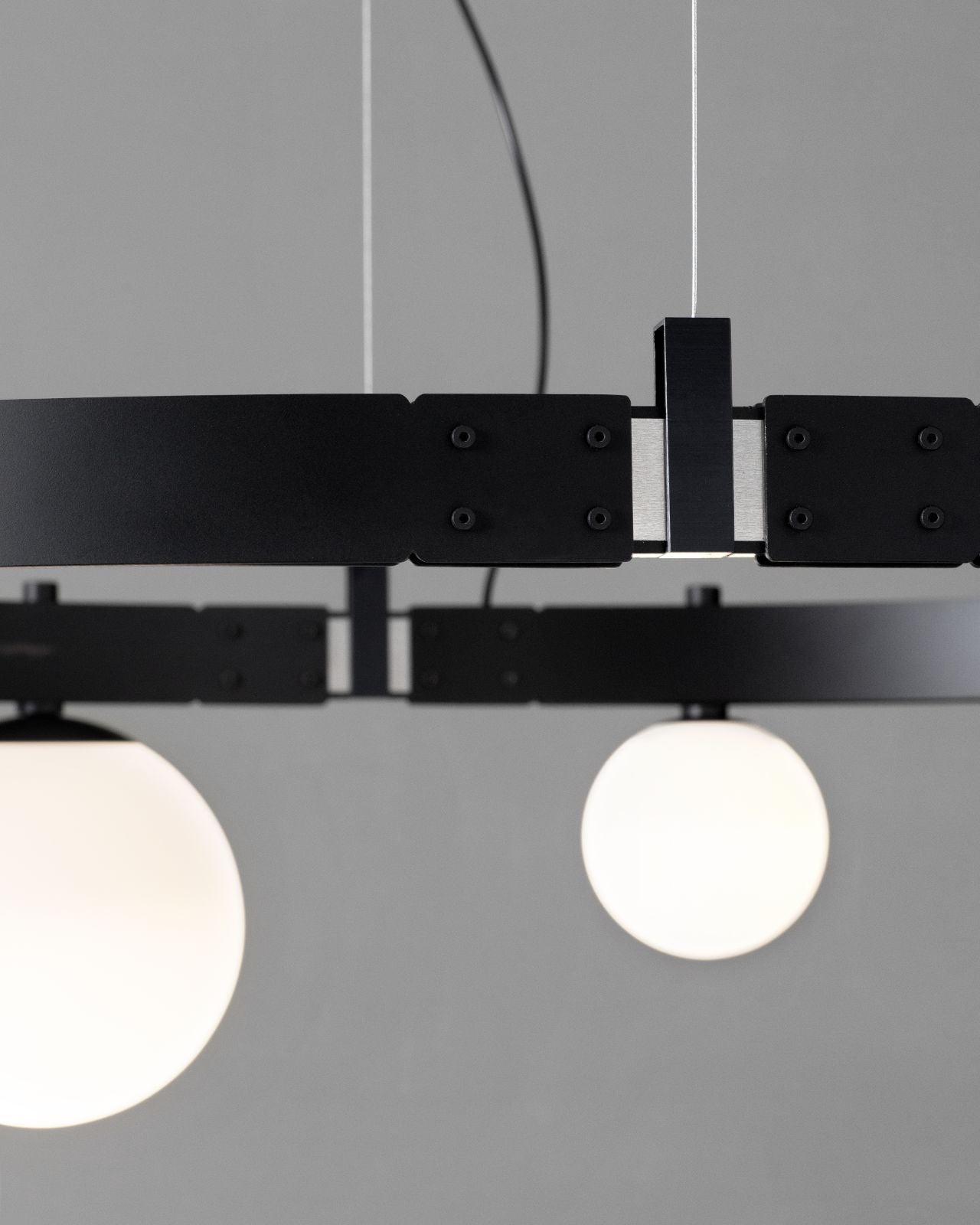 Using the inspiration from geometric shapes, lines and circles, this circular pendant light evokes a sense of drama and modernity. Available in black rings, with four or six orb lights balancing around the Aluminium frame. This light is the perfect Void Filler.