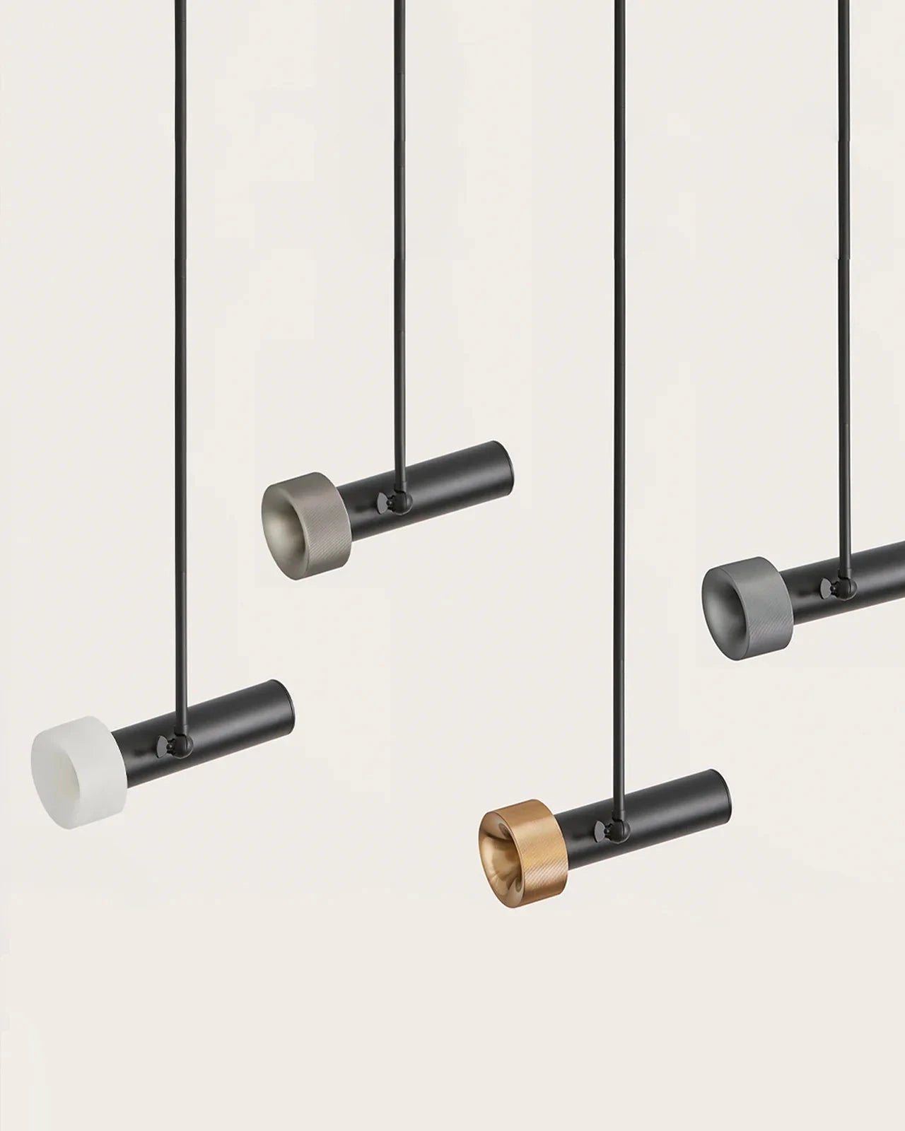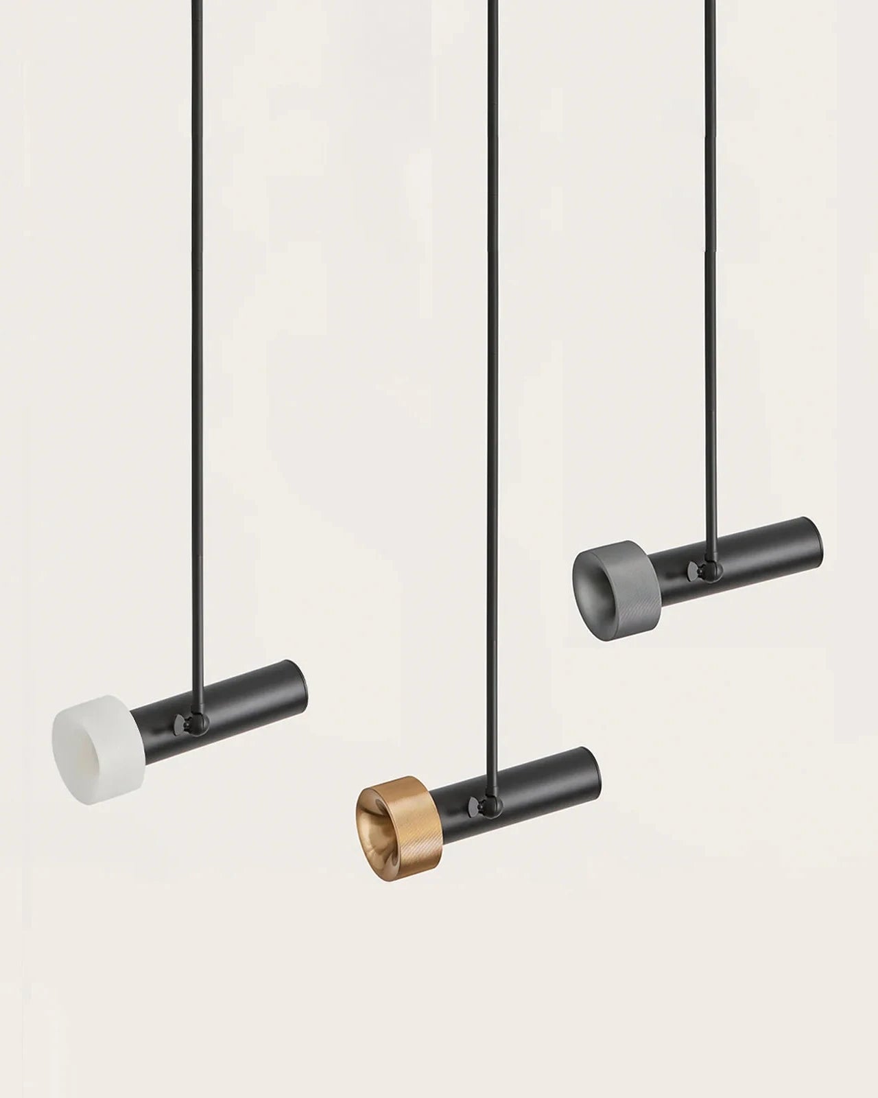 Modern pendant lights with black and gold fixtures on a white background