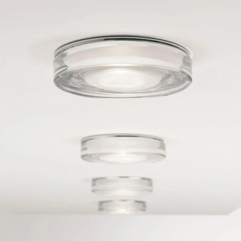 Designed with elegance and grace, this modern round glass ceiling light defies gravity with the emitting glow and soft shadows through the ripples in the glass.