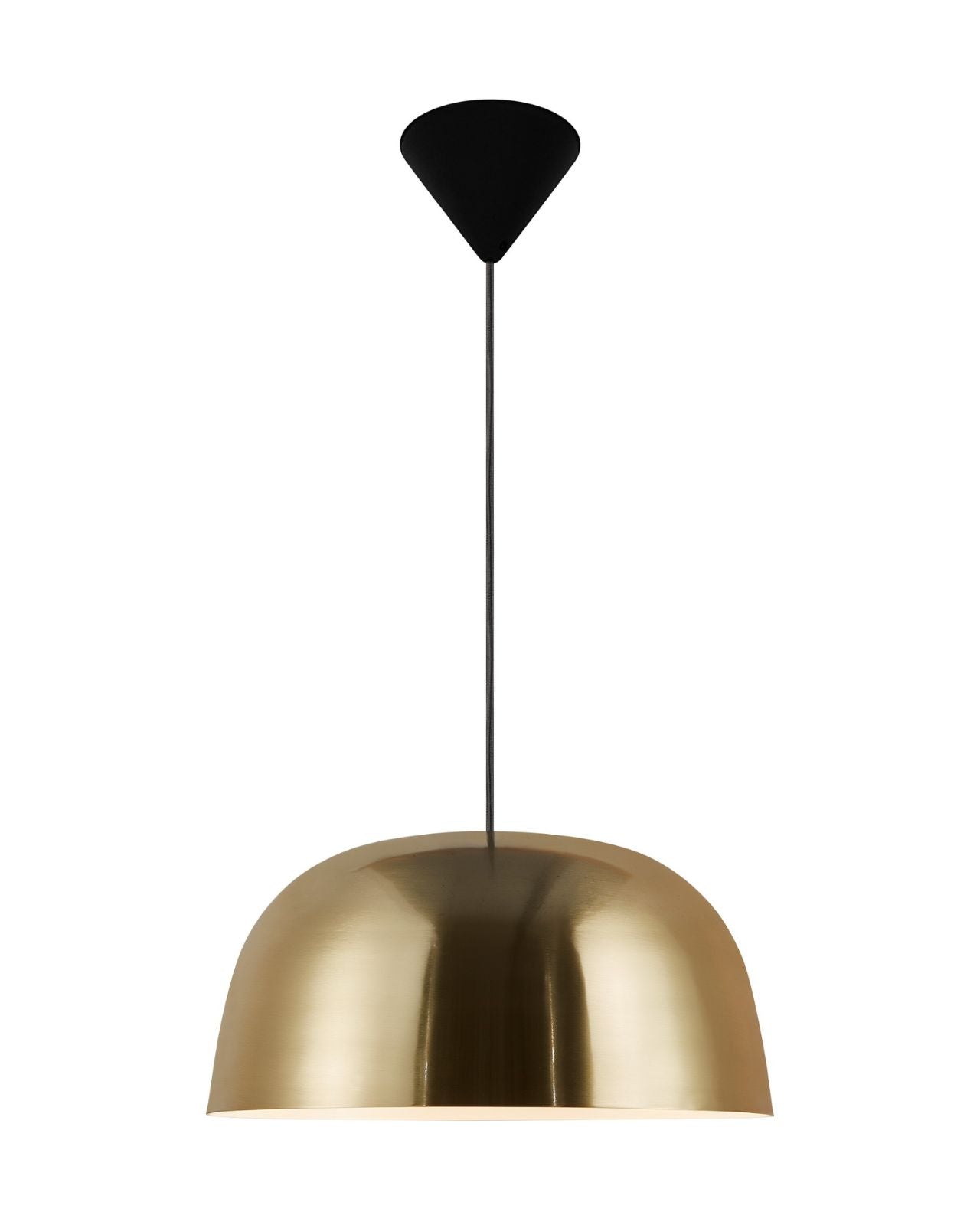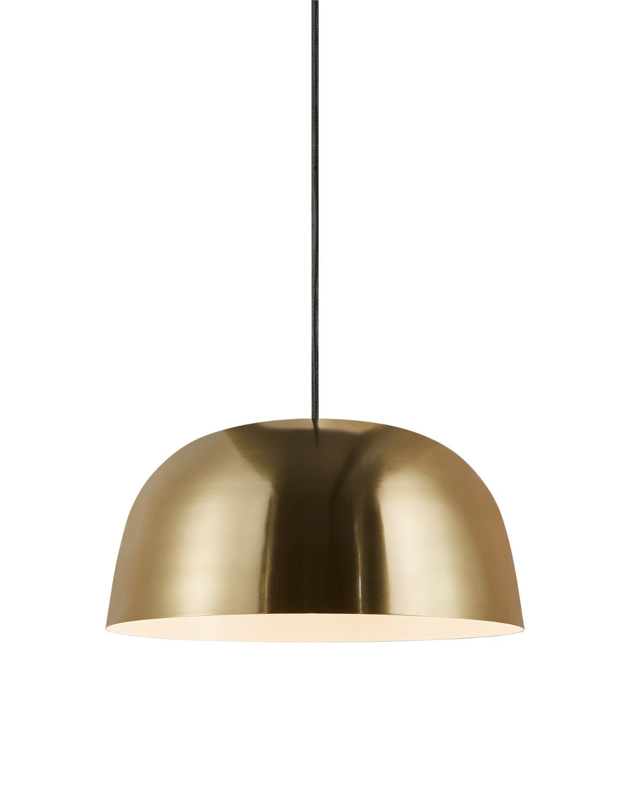 The Scandinavian Brass Dome Pendant combines functional downward light illumination with a Scandinavian contemporary aesthetic, This pendant light is suspended by a 2000mm black textile cable, making it ideal over a dining table or a kitchen island. The broad shade is made from metal with a brass finish, adding warmth, and elegance to modern interiors. Its round and wide shape creates a visual volume contrasting with the sleek suspension cable.