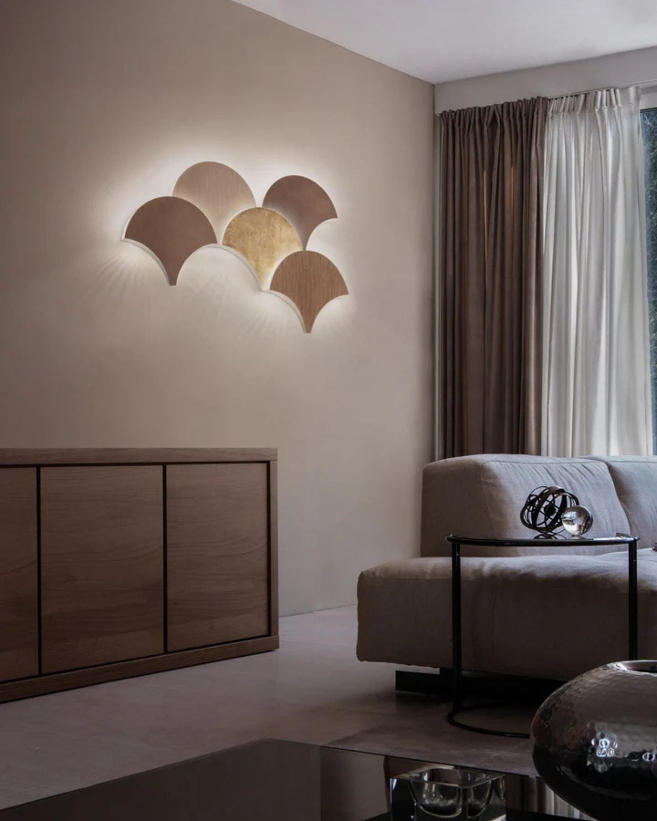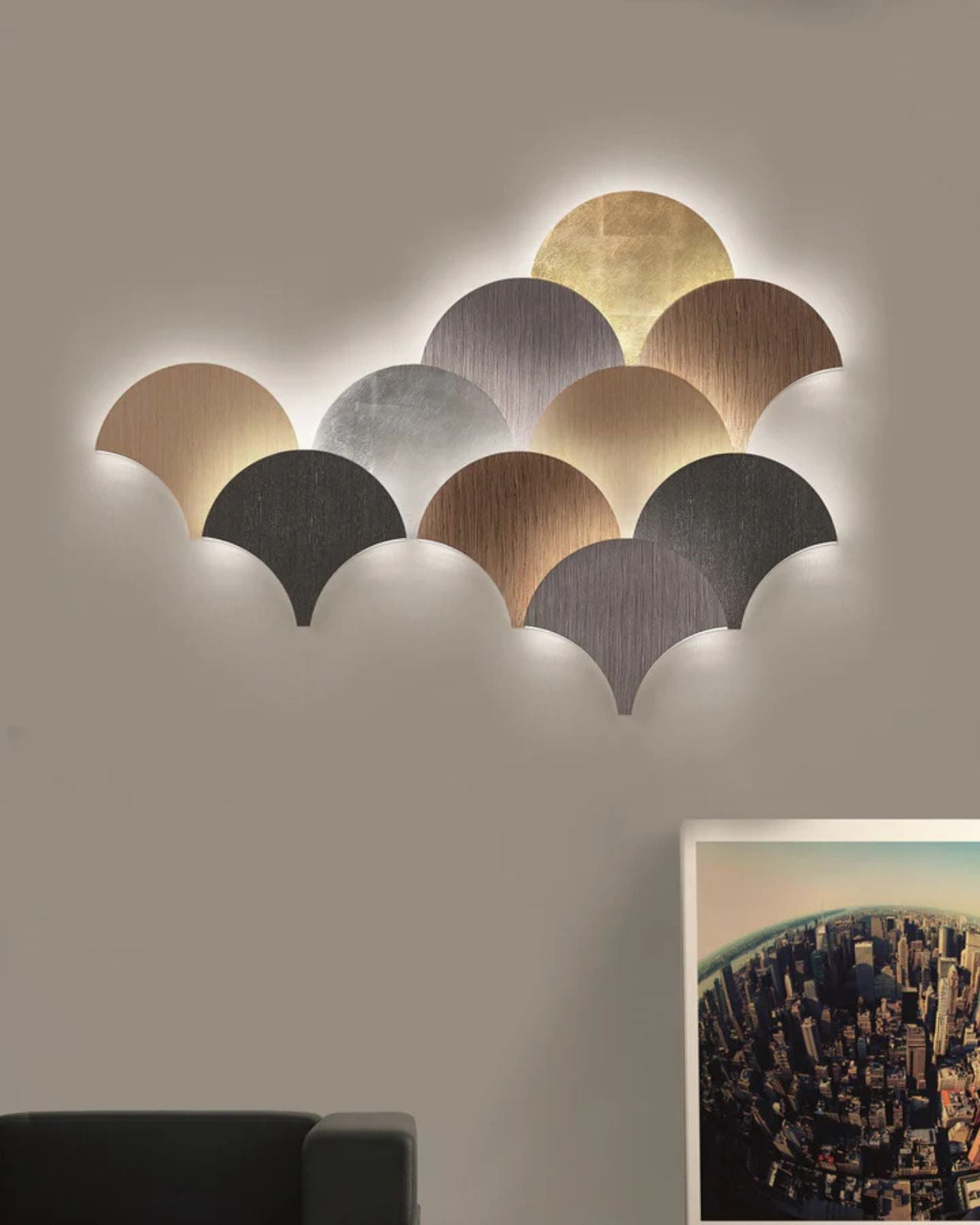 The Shell-Shaped Wall Light is a singular wall lamp that can be connected with others to create a modular lighting system. This fitting has both masculine and feminine elements, with the curved soft shell shape intersecting with leathers and metals to create an eye-catching focal piece. Featuring a metal panel, backlit by integrated LED's. Available in two sizes and 10 different finishes.