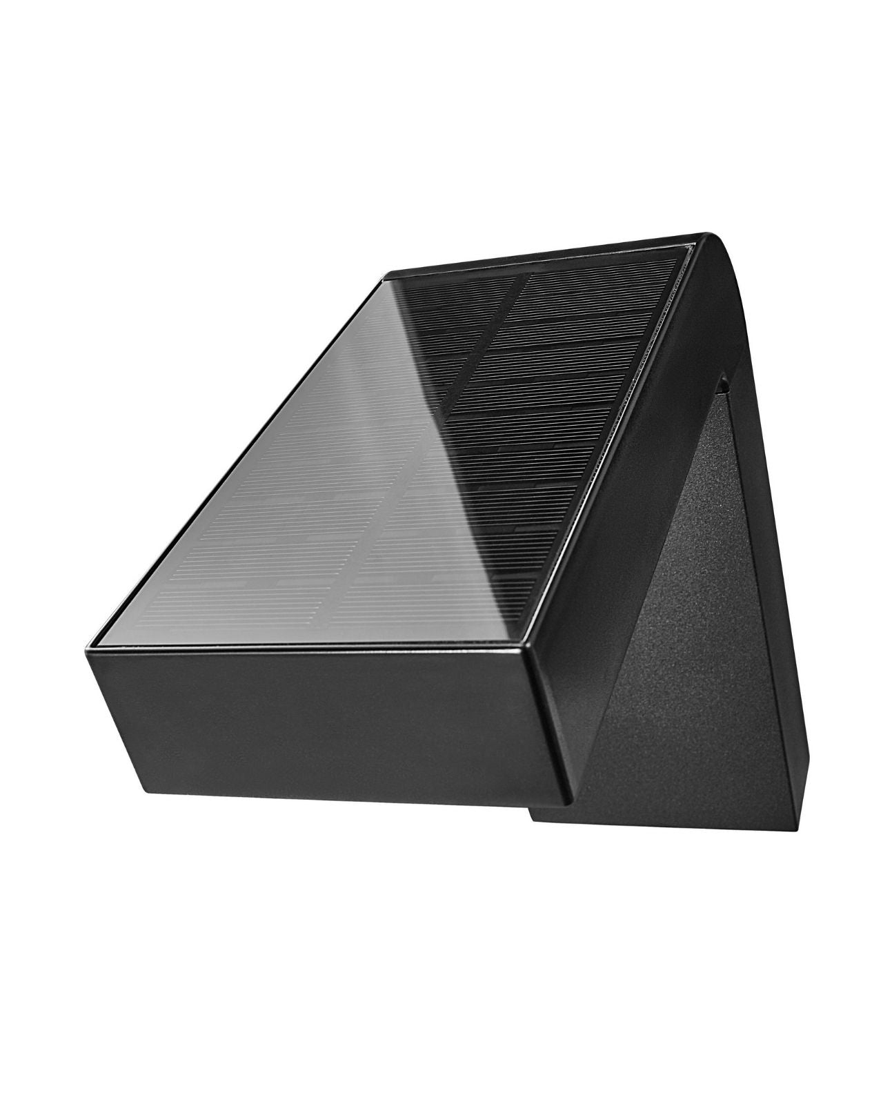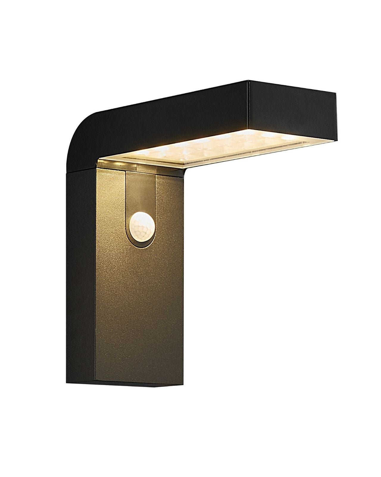 Constructed from durable plastic and boasting a sleek black finish, this wall light has a simplistic design and angled shape. It features a solar panel at the top, efficiently converting sunlight to electricity and storing it in a battery. With an inbuilt sensor that detects movement within an 8-meter range, this light will automatically turn on. With an IP44 rating, this design is suitable for covered areas such as main entrances, garages, and terraces. Emitting a downward glow in a pleasant, warm white tone, it is perfect for providing both illumination and ambience.