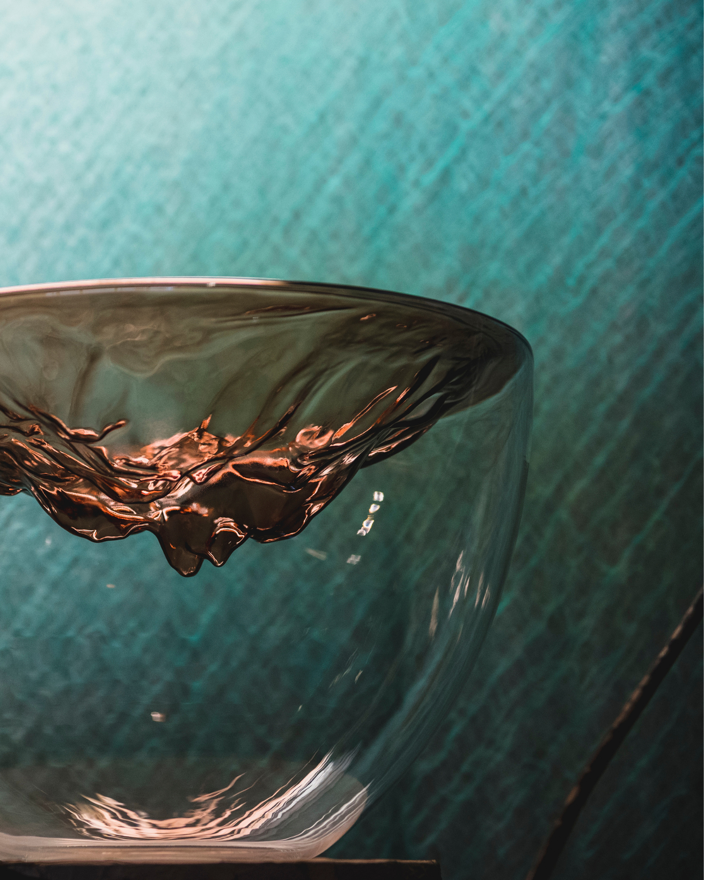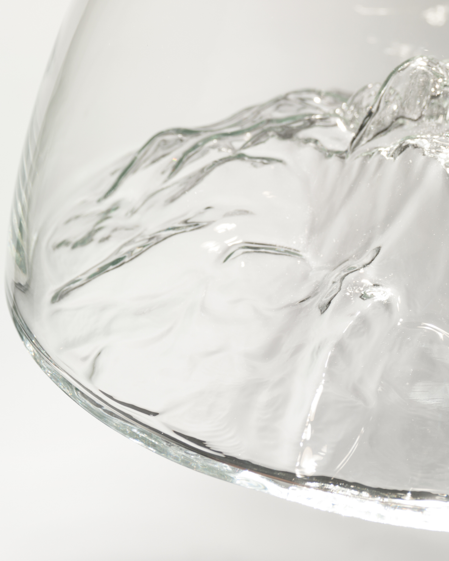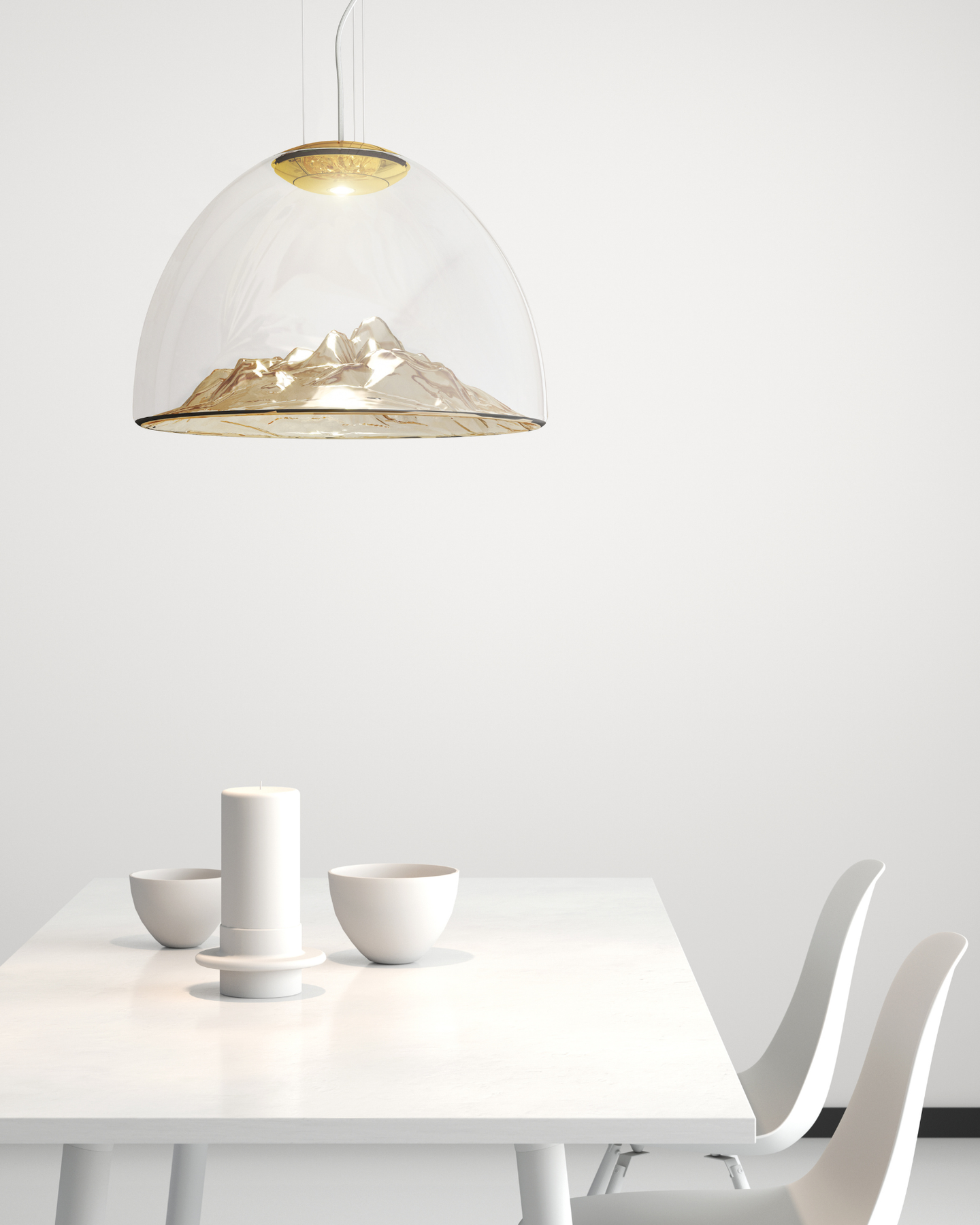 The extraordinary glass mountainscape is encased in a large glass hemisphere, with each rocky formation artfully diffusing the warm LED light to highlight the topography and create stunning patterns.