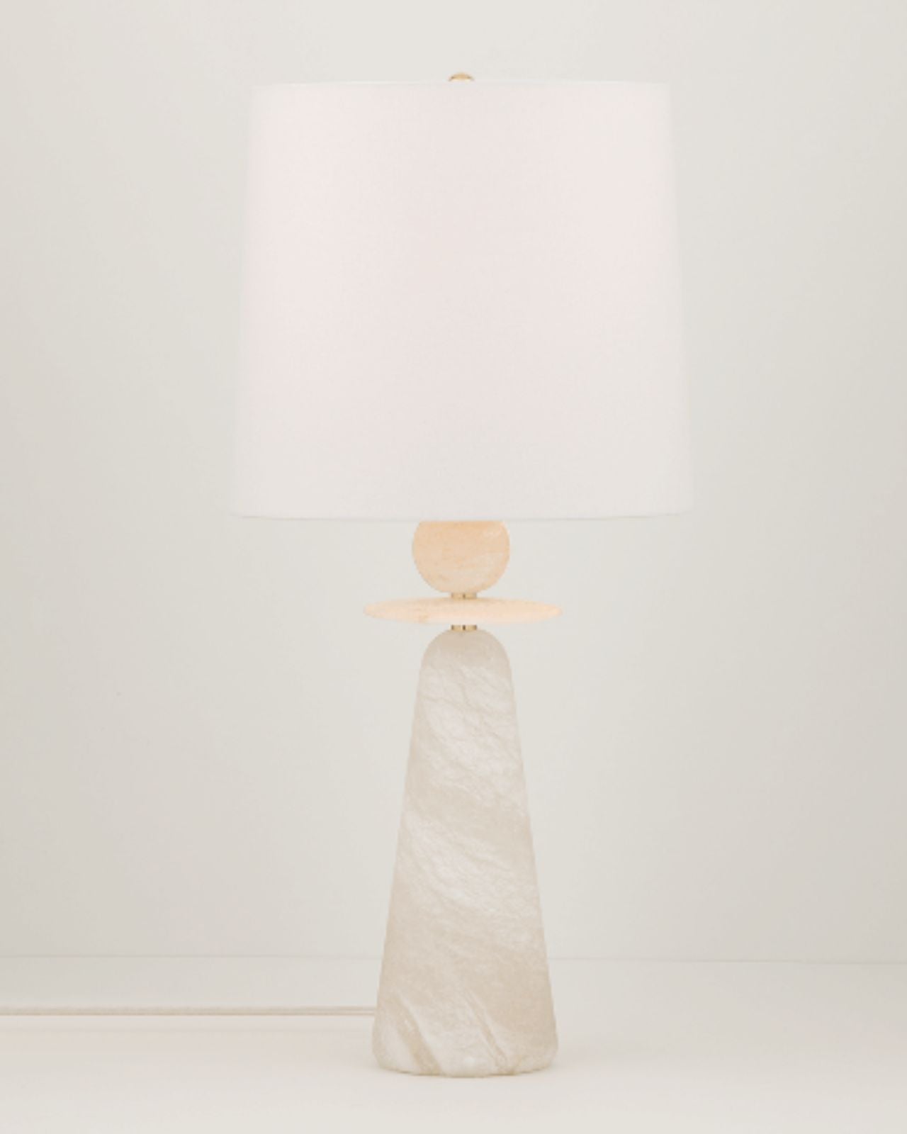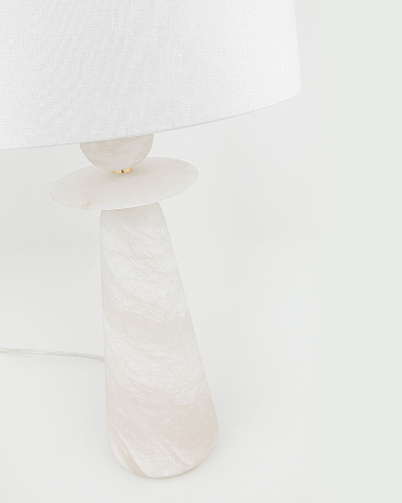 The Classical Alabaster Table Lamp is a timeless piece. Inspired by Mid-Century designs, this lamp includes a detailed disc, sphere, and base all crafted to look as if they're balancing on top of each other. Featuring brass detailing and a Belgian Linen drum shade that has a top diffuser, this fitting diffuses light elegantly, concentrating the light in and below the shade. Ideal for hallway consoles and bedroom side tables.