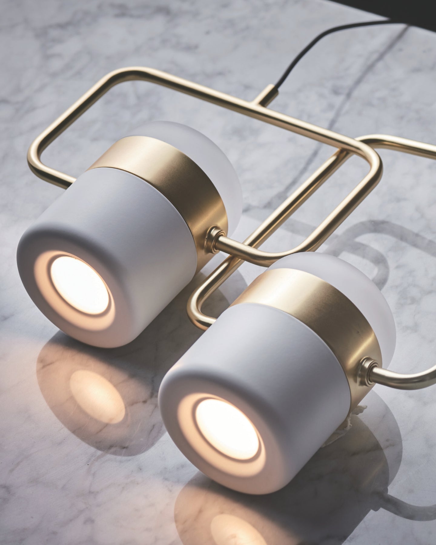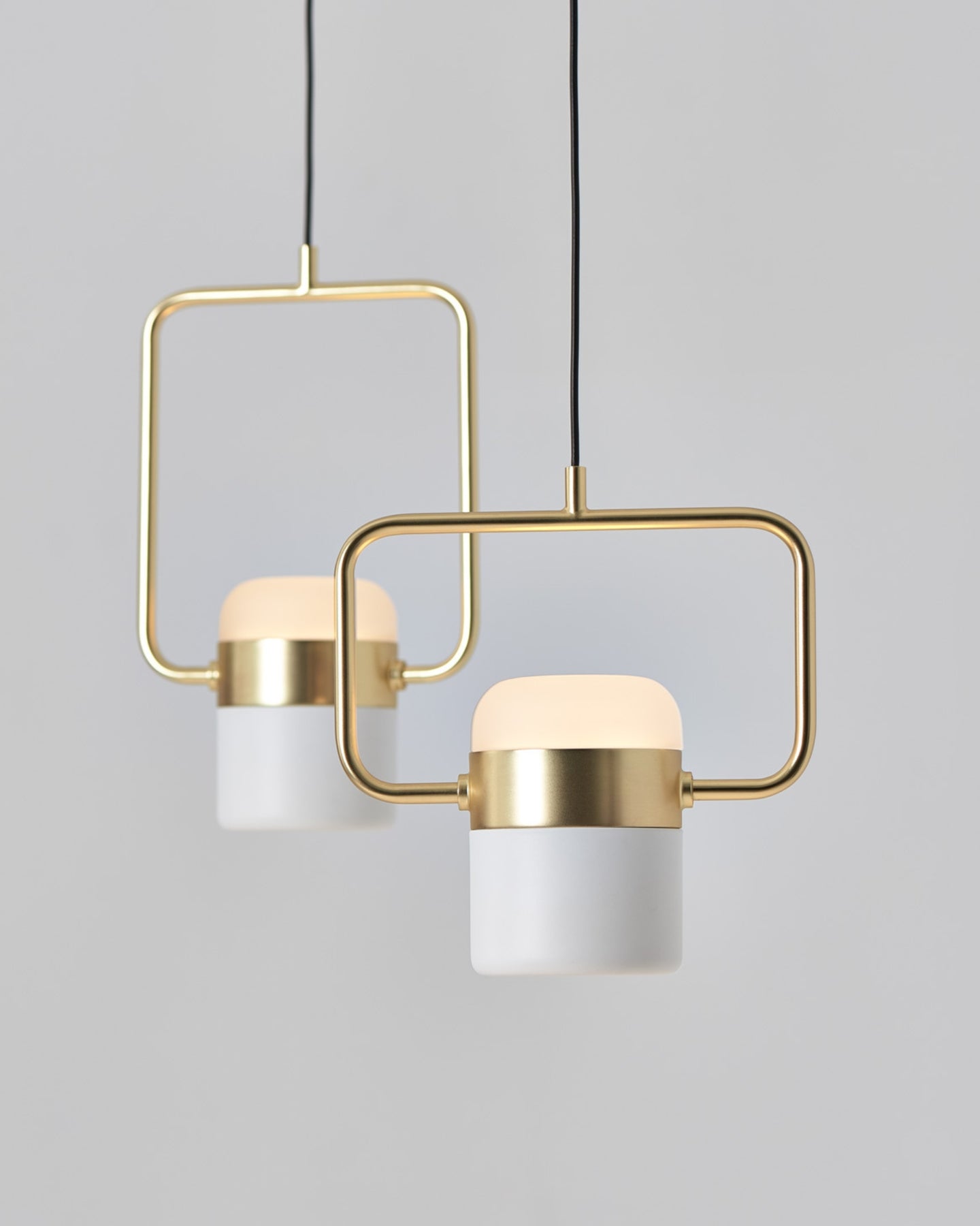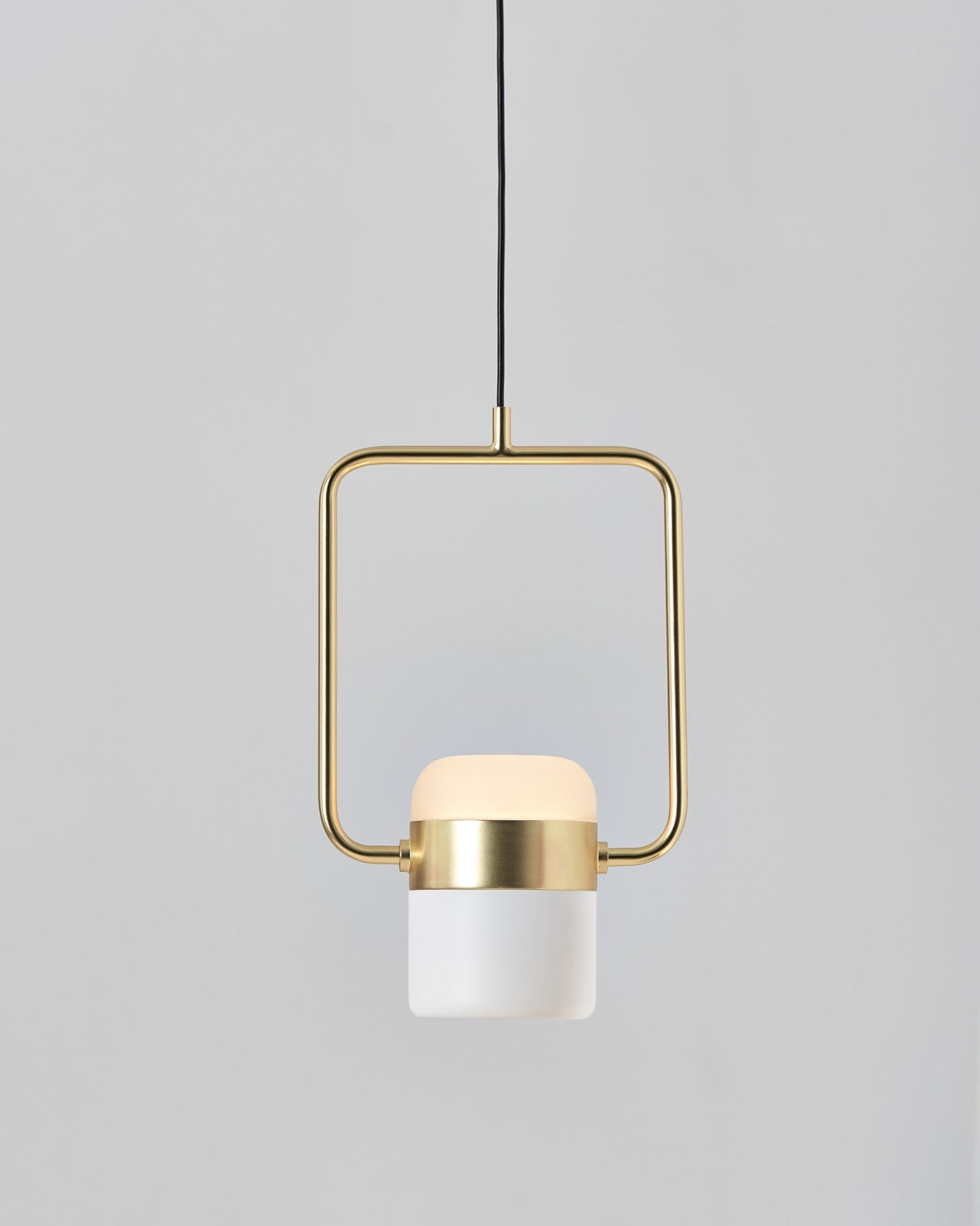 The Modern Concrete and Brass Pendant Light is inspired by Taiwan's patterned metal fences. The white frosted shade is complemented with matt brass metal rings achieving an elegantly modern look. With a built-in dimmable driver, interior reflectors and an adjustable shade, this pendant will achieve ambience and illumination for any space. Available in vertical or horizontal versions.