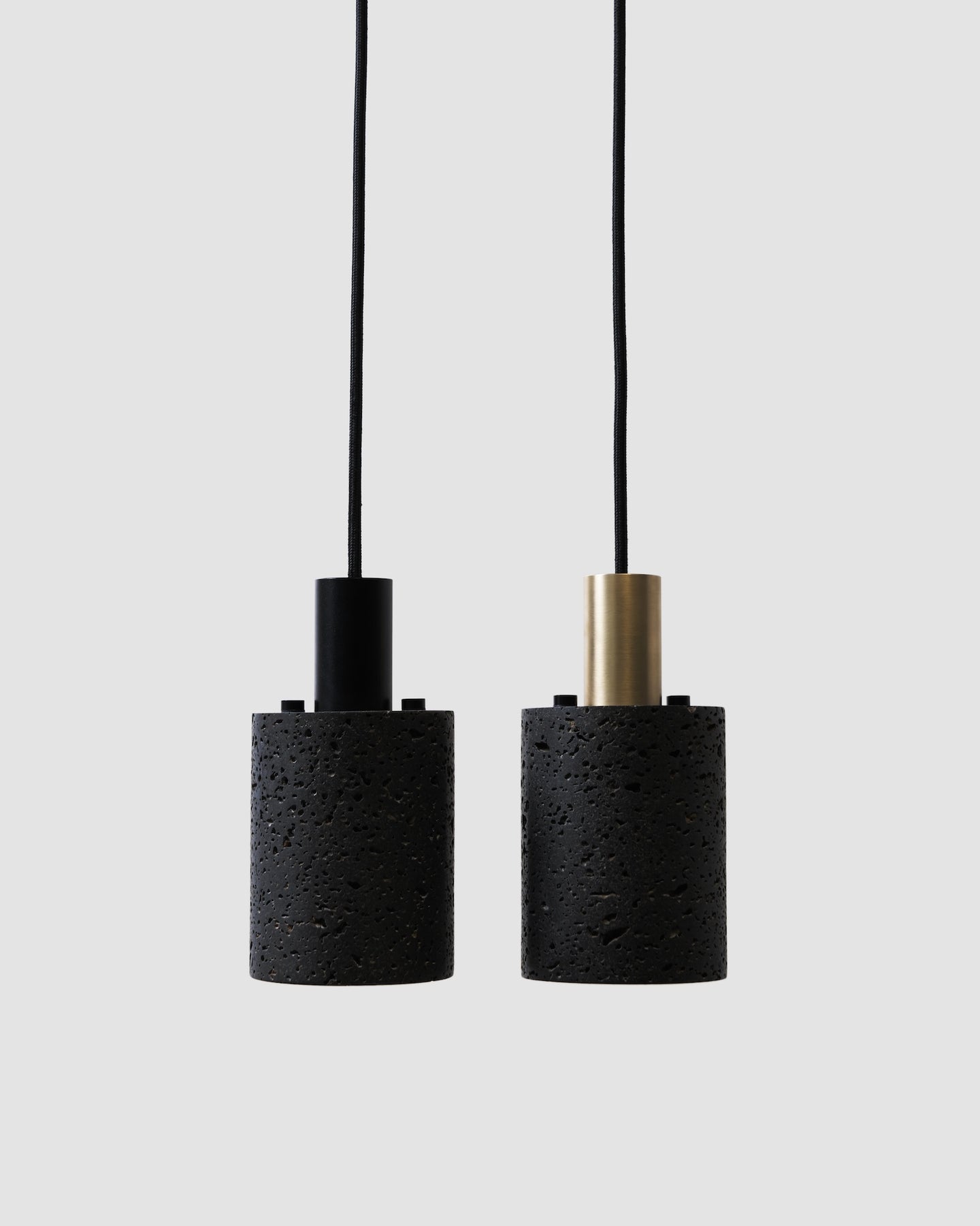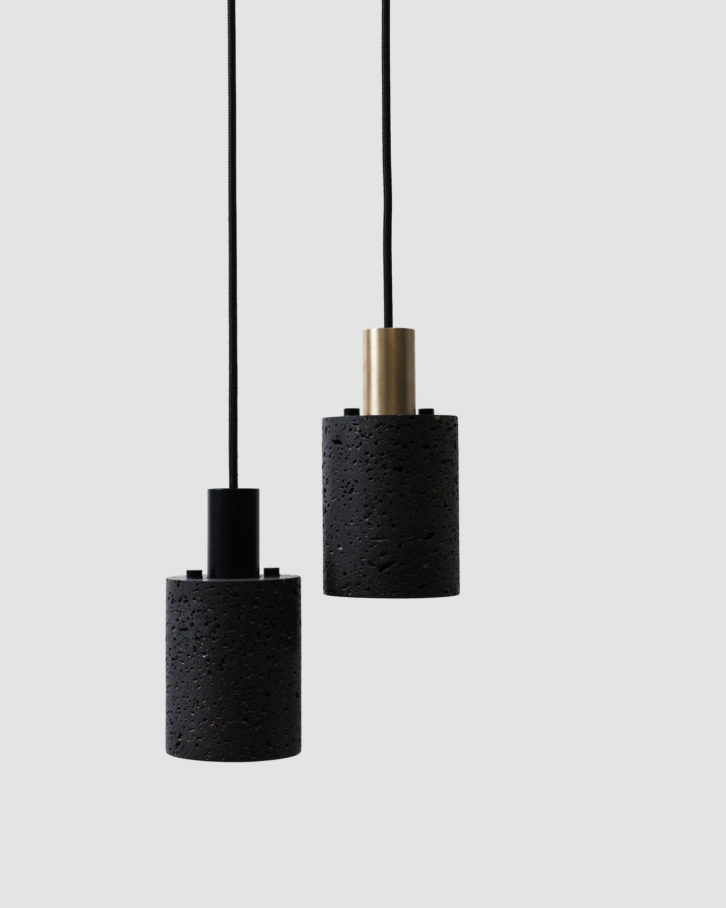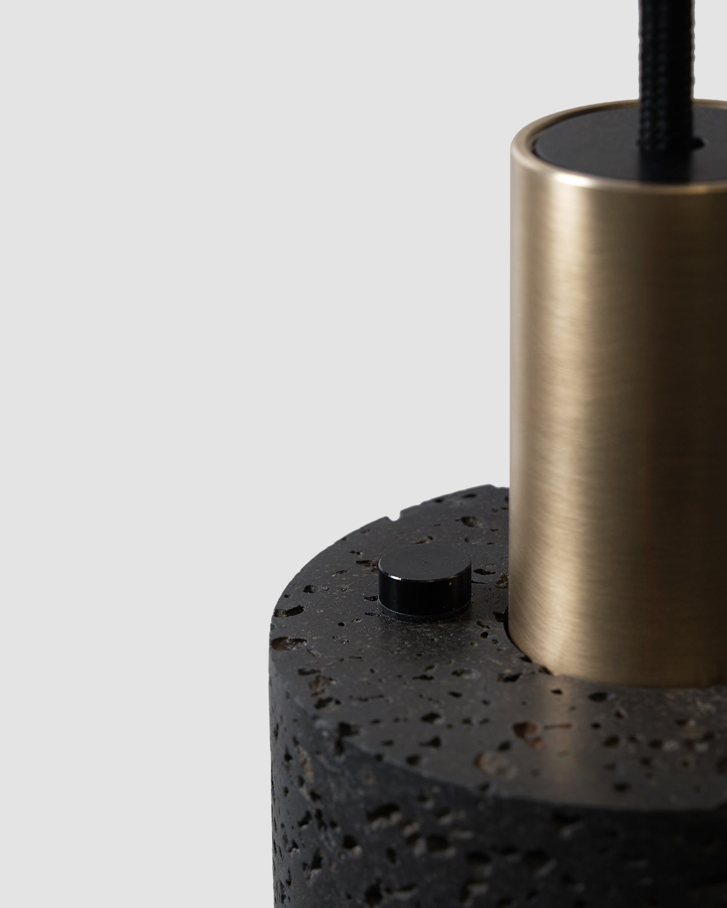 The N Lava Pendant Light is a minimalist fitting, made up of stacked cylinders with exposed elements. Available with Brass or Black Anodised details, this pendant fuses Industrial and Organic materials, combining metal components and lava stone. With the bold black colour of the lava stone, this pendant is a statement piece, and looks great above a kitchen bench or dining table in a row of three or four.