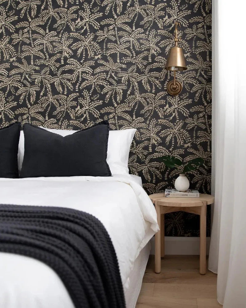 Bedroom with palm leaf patterned wallpaper, white bedding, and Adjustable Vintage Brass Wall Light