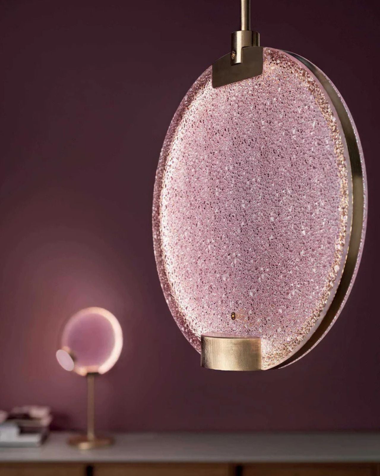A timeless circular glass pendant using a frosted finish in a range of soft colours, this pendant light brings an artistic and creative feel to any room. Perfect as a statement piece or within a cluster. This light boasts elegance in a fun and delicate way. Prismatic glass and featured brushed brass metal details bring a colour ethereal wonder to your rooms.