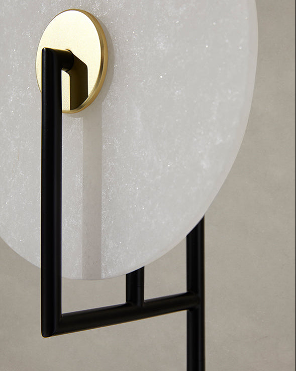 This decorative table lamp is comprised of a steel structure finished in matte black with subtle brass detailing topped with a disc shade. This elegant design will provide warm indirect light suited for placement on bedside tables, hallway consoles or desks. Available in an assortment of disc finishes.