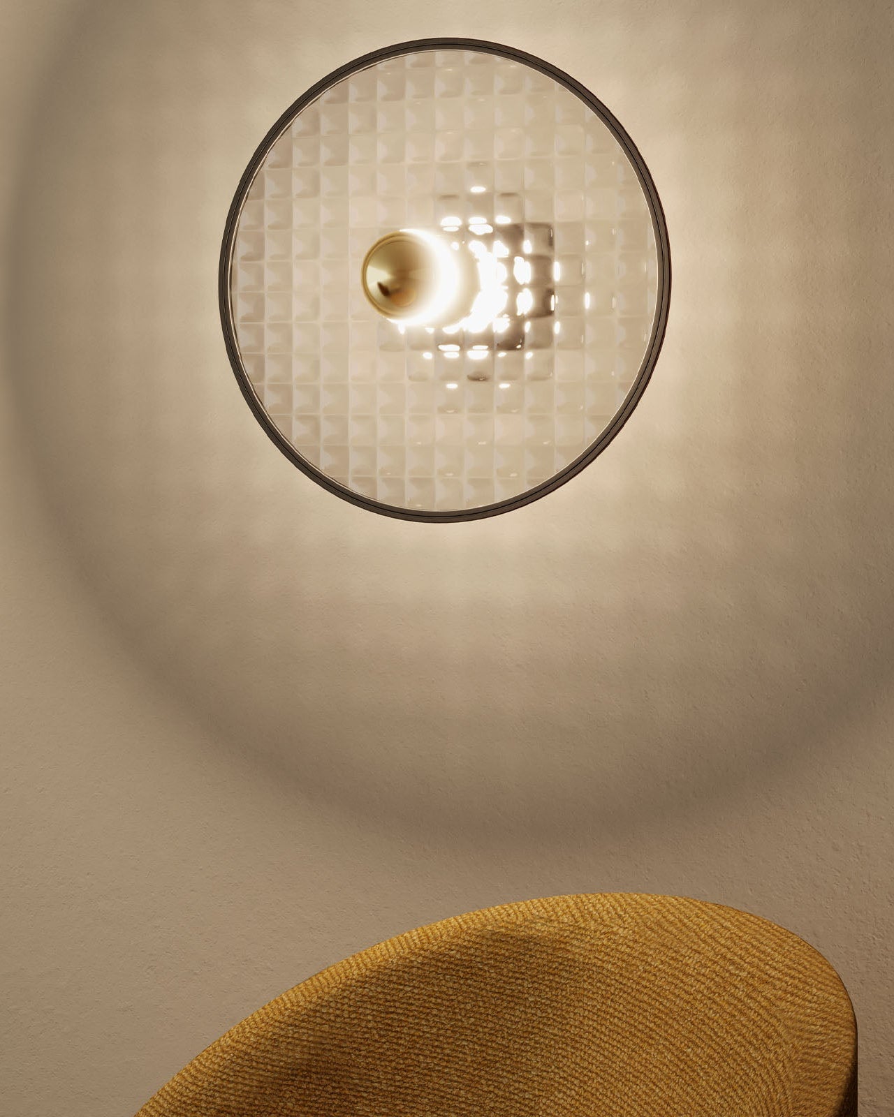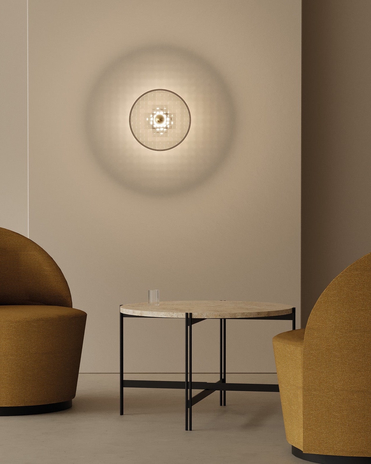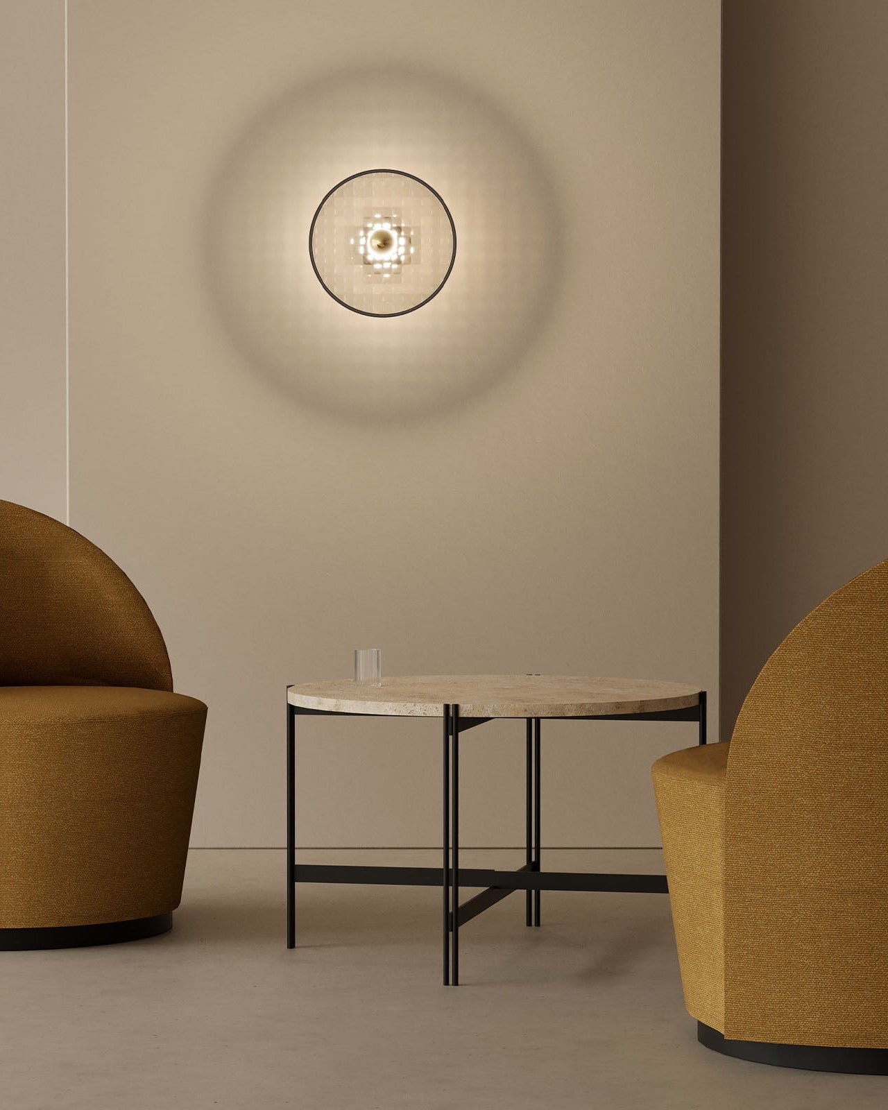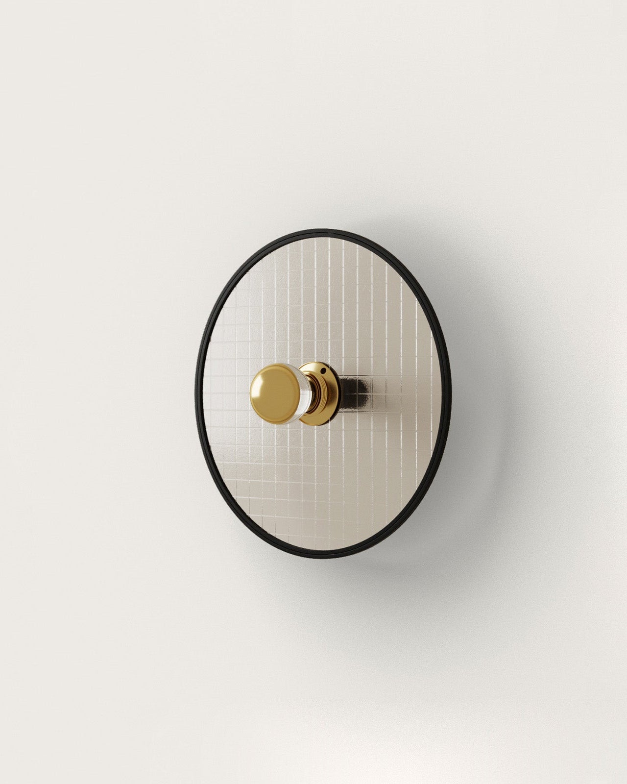 To make an artistic statement, this wall light will play on the reflections and textures created by the unique choice of textured glass. The Minimalist Textured Glass Wall Light is a contemporary design featuring circular textured glass, contrasted with a black steel edge to allow this wall lamp to illuminate from within to elevate living rooms, dining rooms, and entryway interior spaces. Available in three metal base finishes including Gold, Chrome, and Black.