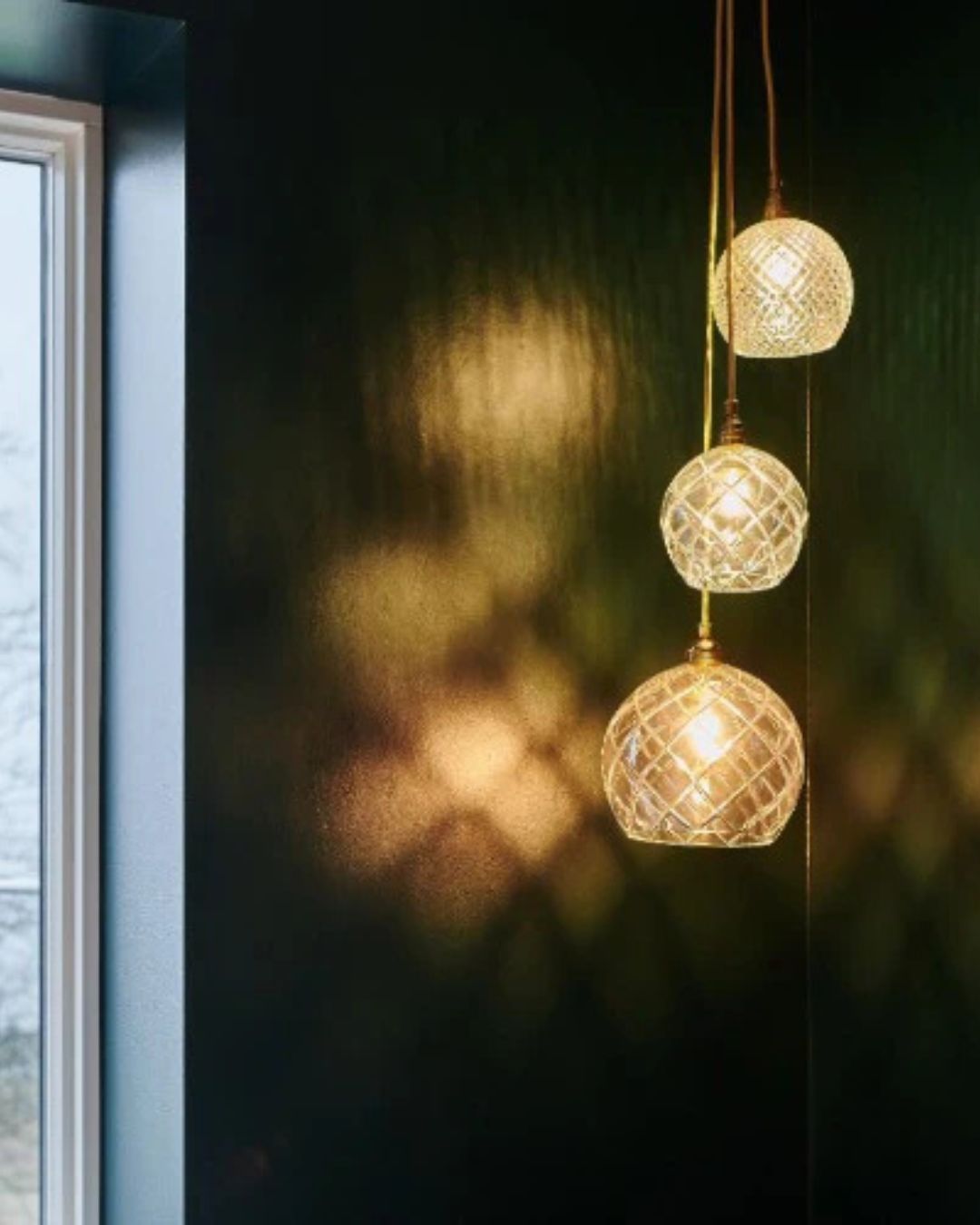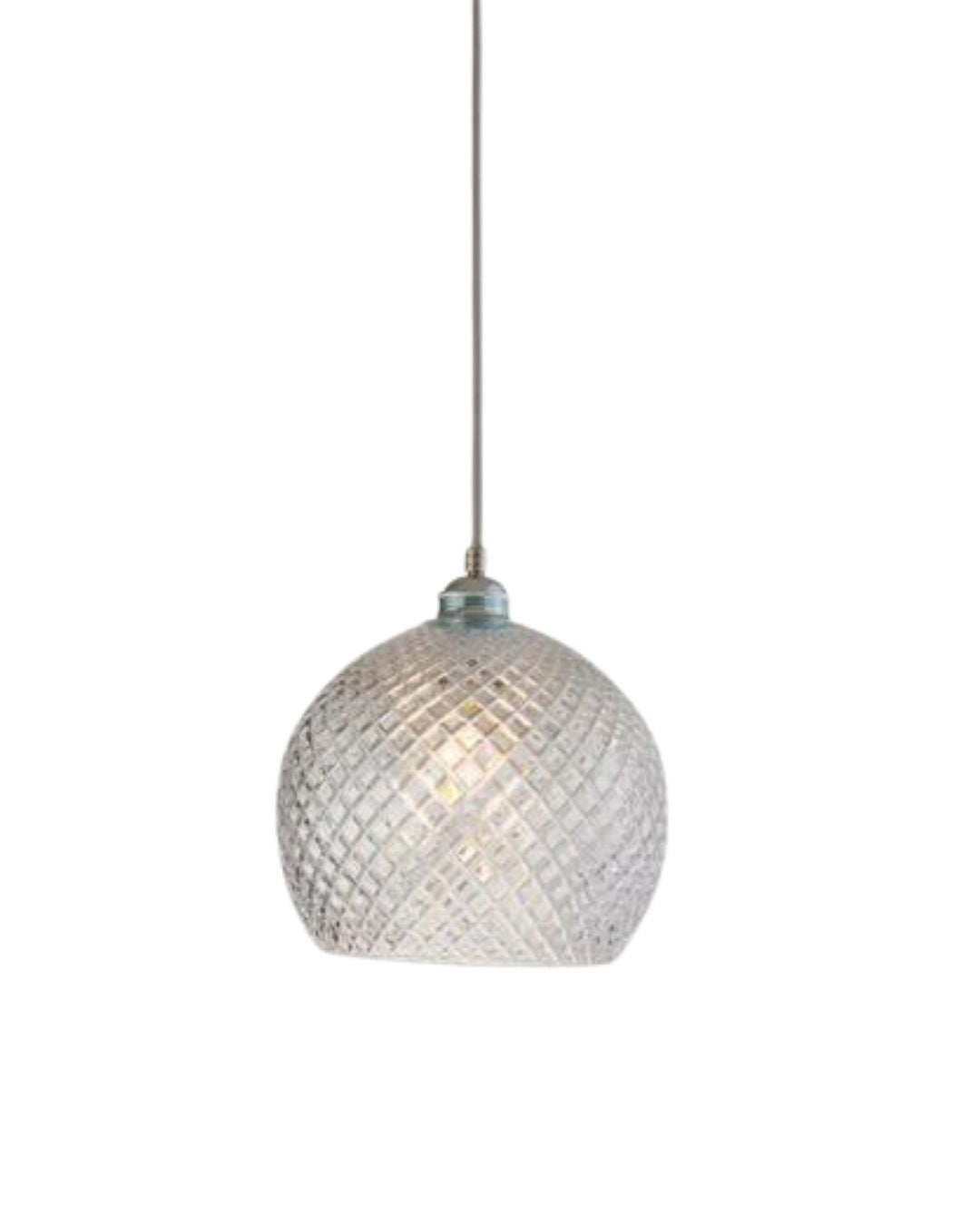 The Retro Glass Domed Pendant Light can be used to create a timeless atmosphere in both traditional and modern interior design. It is offered in two sizes and is crafted from hand-blown clear glass with a matte gold suspension and intricate patterning, making it a beautiful and unique addition to any living or dining area.