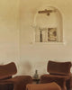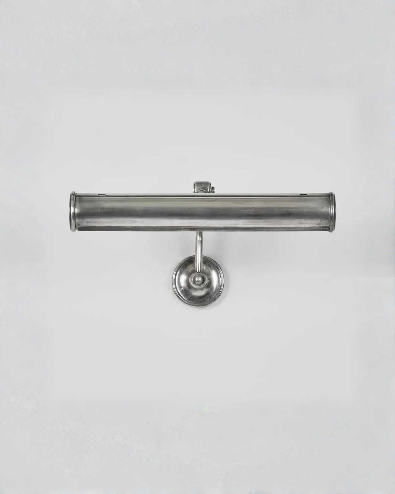 A solid brass picture light with an adjustable join, mounted on a wall above a picture, with two armchairs in the foreground.