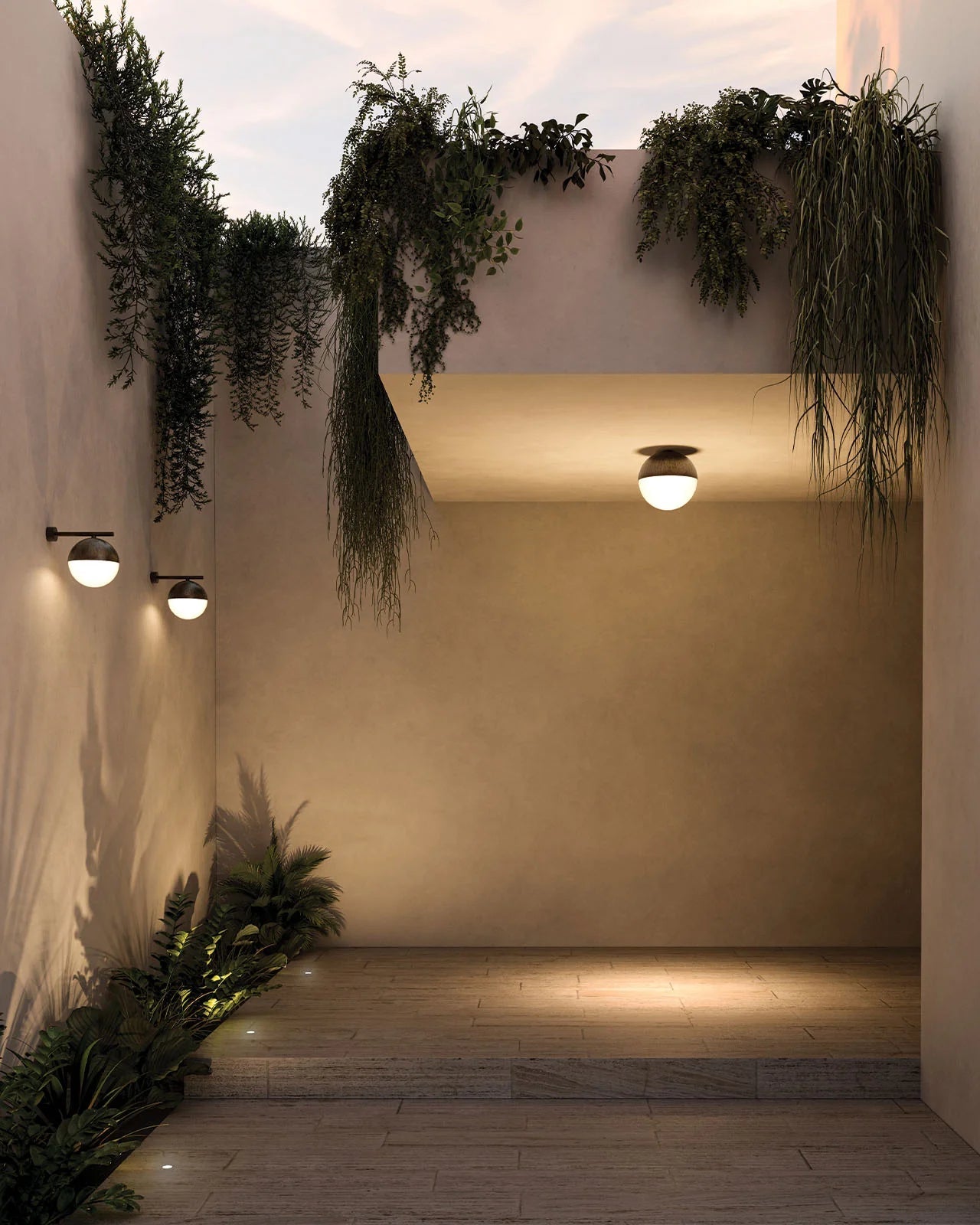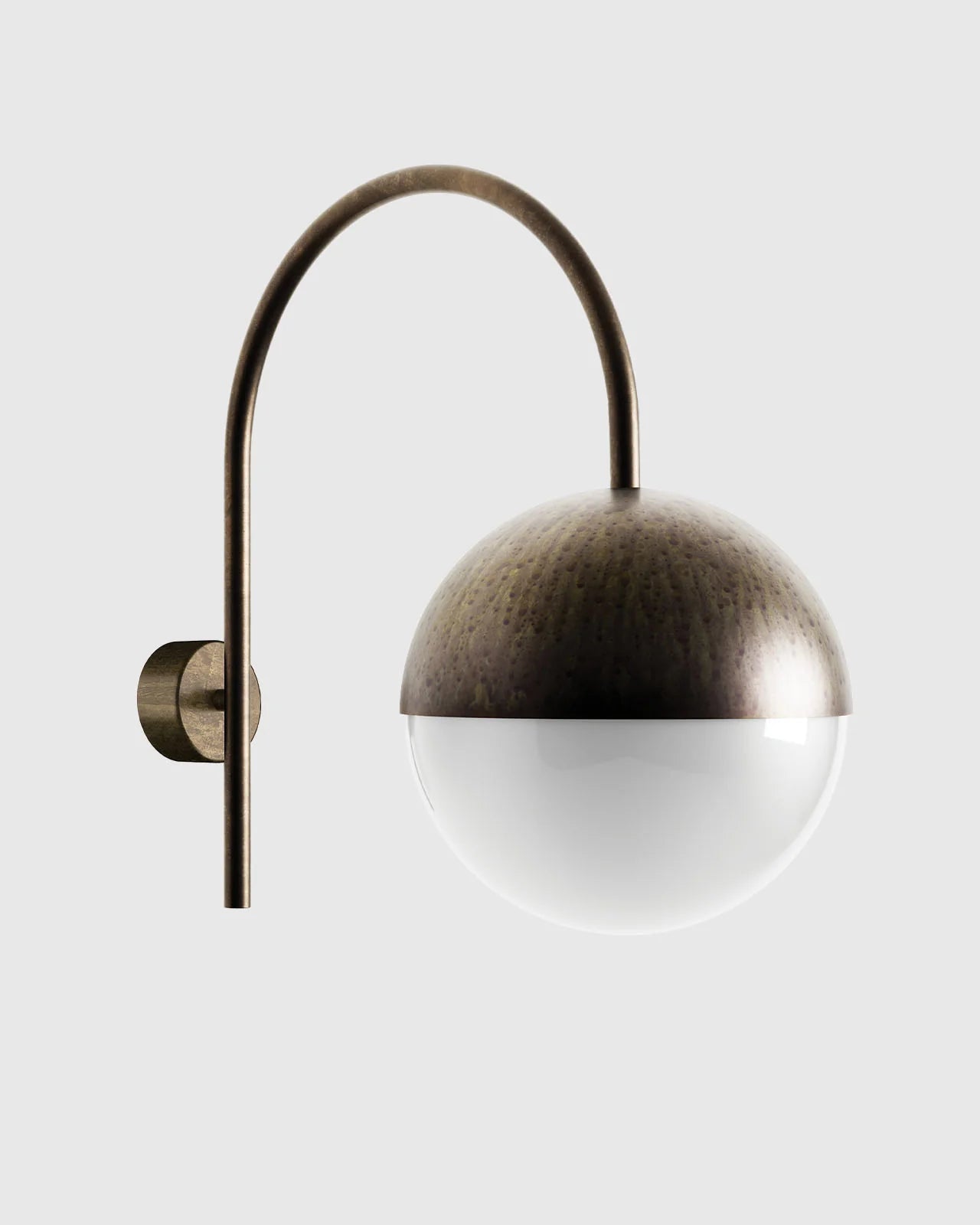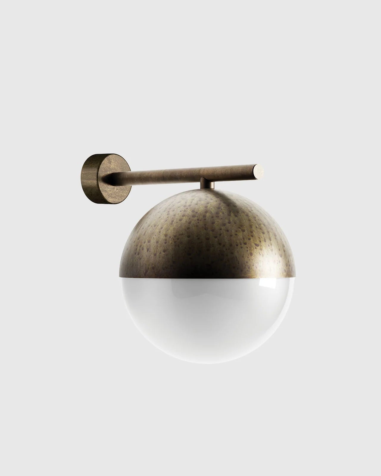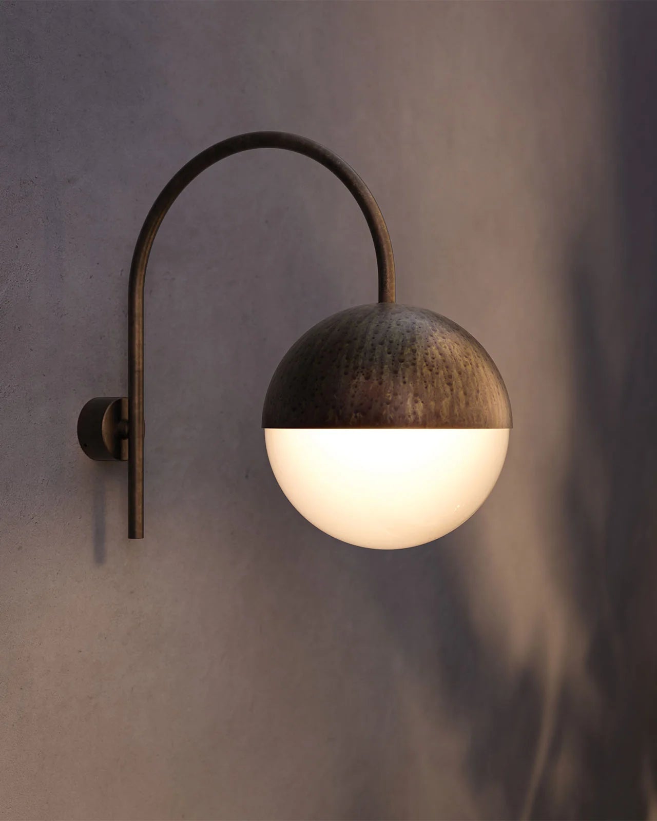 The Outdoor Antique Brass Spherical Wall Light showcases an elegant white blown glass sphere enclosed by an antique brass dome. IP65 rated, this light will is durable and will withstand any wet weather, making it ideal for entrances, garden paths, patios or terraces. Combining the simplicity of geometric design and the characteristic materiality of the Mediterranean, this fixture will provide a pleasant glare-free and cosy light to modern, minimalist or industrial spaces.
