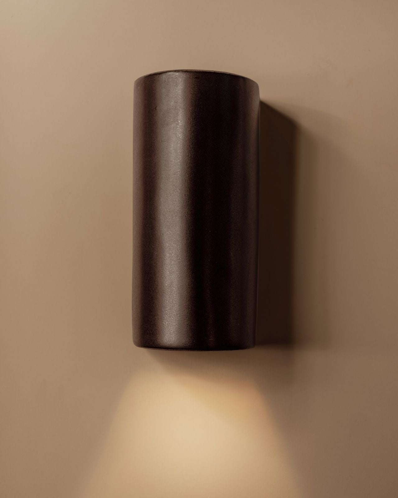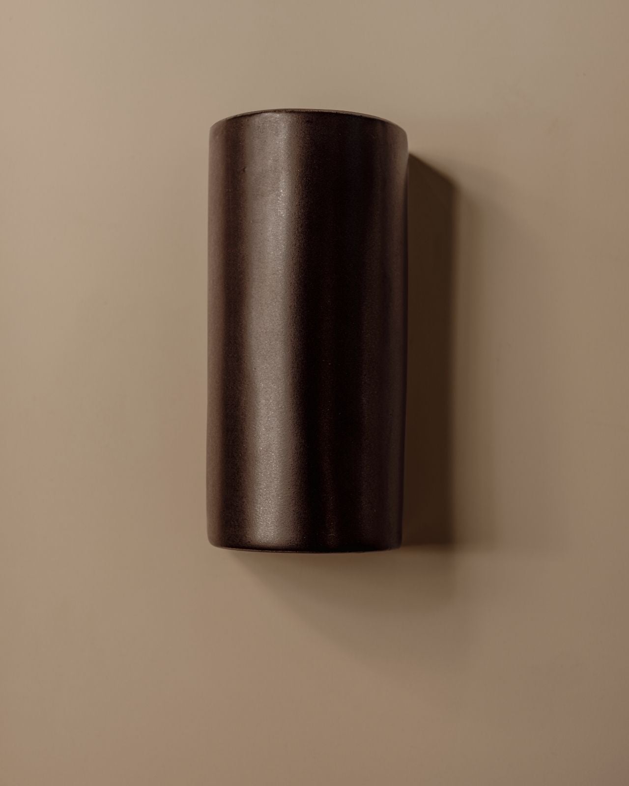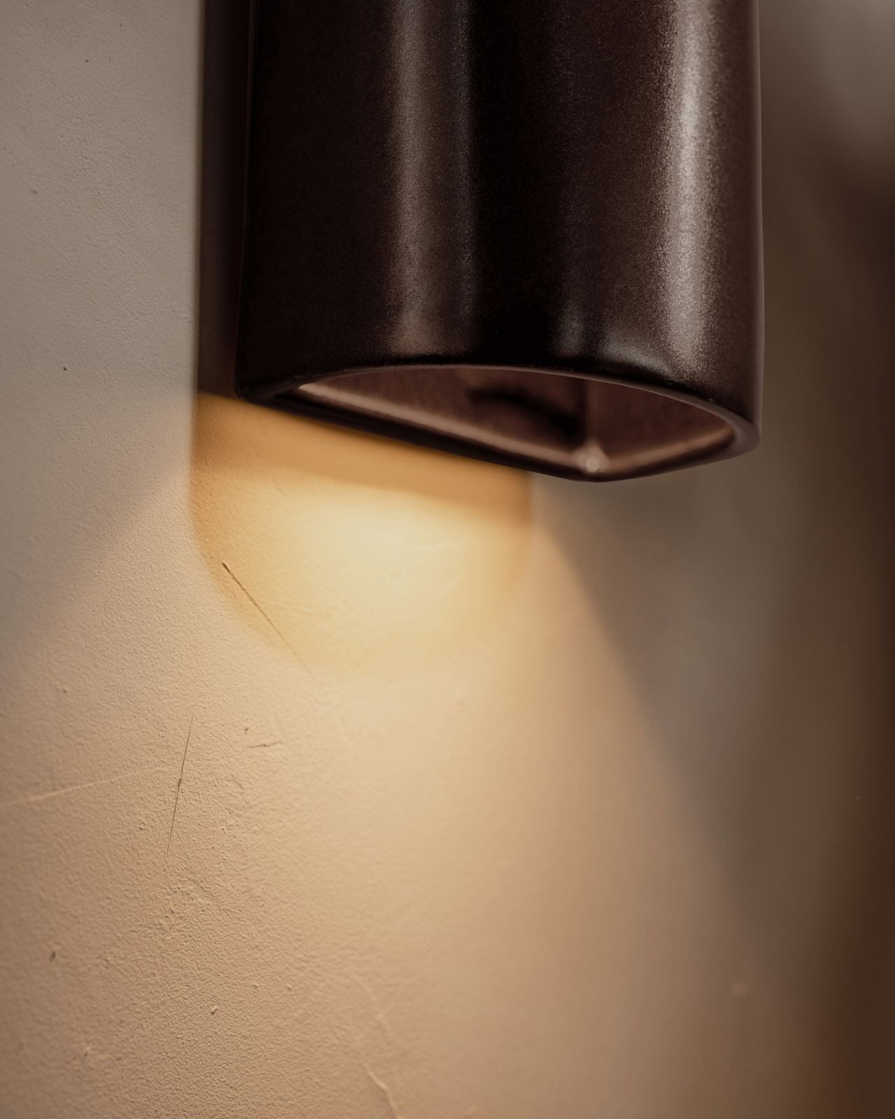 Setting a darker and atmospheric ambience to living rooms, bedrooms or hallways, this stunning slip-cast wall light is handmade from raw and natural ceramic in Tasmania and will spread a pleasant light downwards with a soft upwards glow. Encapsulating the architectural vision of Saxon Hall, a renowned Tasmanian architect, this short or elongated curved fixture will stand out on a timber or concrete wall with its captivating dark charcoal finish and its shimmering effect when bathed in sunlight, reminiscent of a metallic finish. To ensure a perfect fit against the wall, an electrical back plate is included.