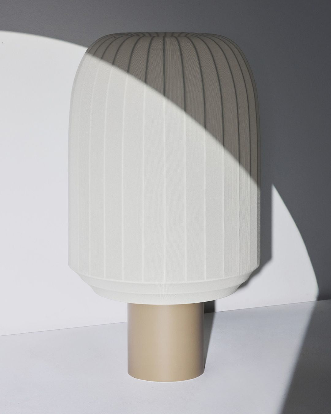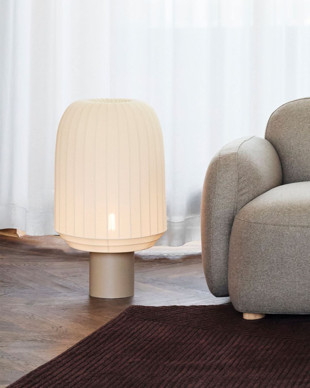 Its sculptural form makes it an ideal statement piece for living rooms, bedrooms, lounge areas, and relaxed commercial spaces. The oversized shade introduces a tactile element that adds depth and comfort to contemporary settings, while the open, lightweight frame keeps the design visually balanced.