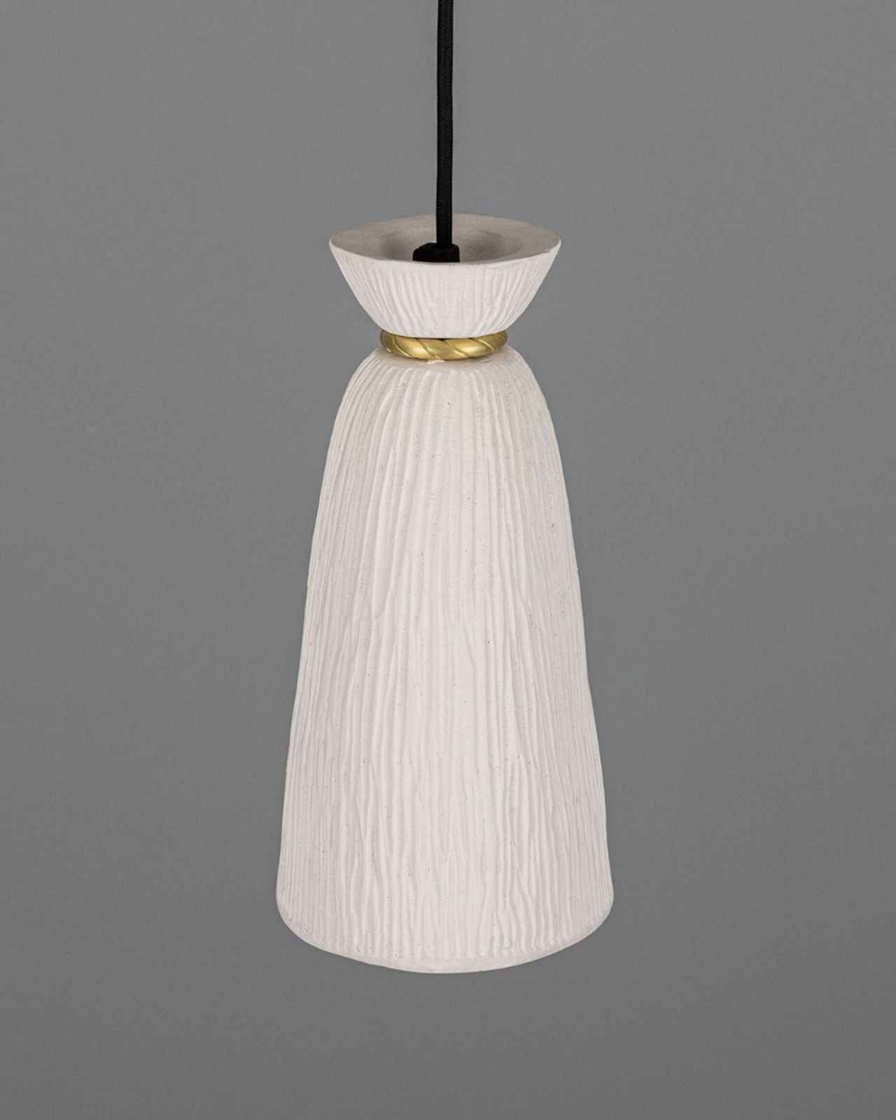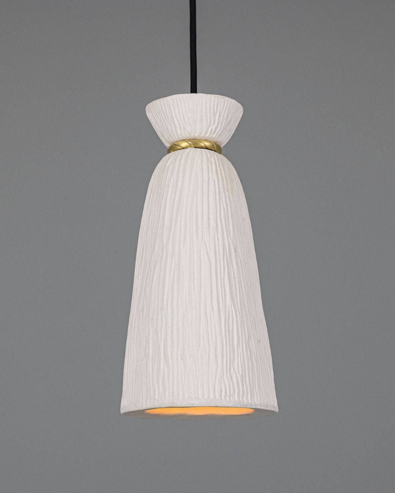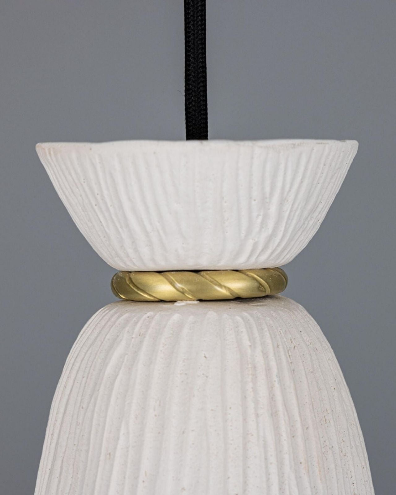 The Long Ceramic Grooved Pendant, crafted in Ireland, draws inspiration from the Aspen tree's tall stature. Its cone-shaped ceramic shade intertwines organic materials with brass, featuring a braided brass ring and hand-carved grooves. Perfect for illuminating dining areas, and corners of living areas, installed on either side of a master bed. This design will add a touch of organic elegance to any room.
