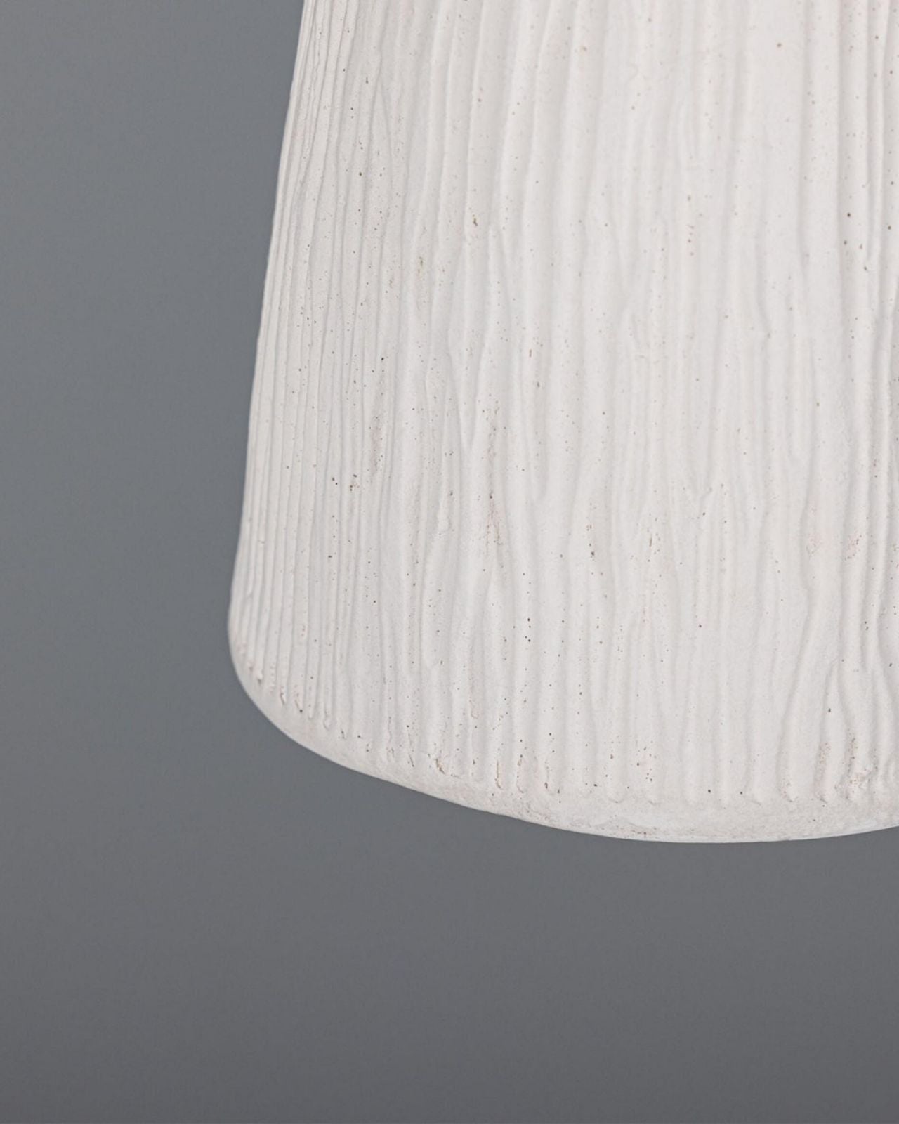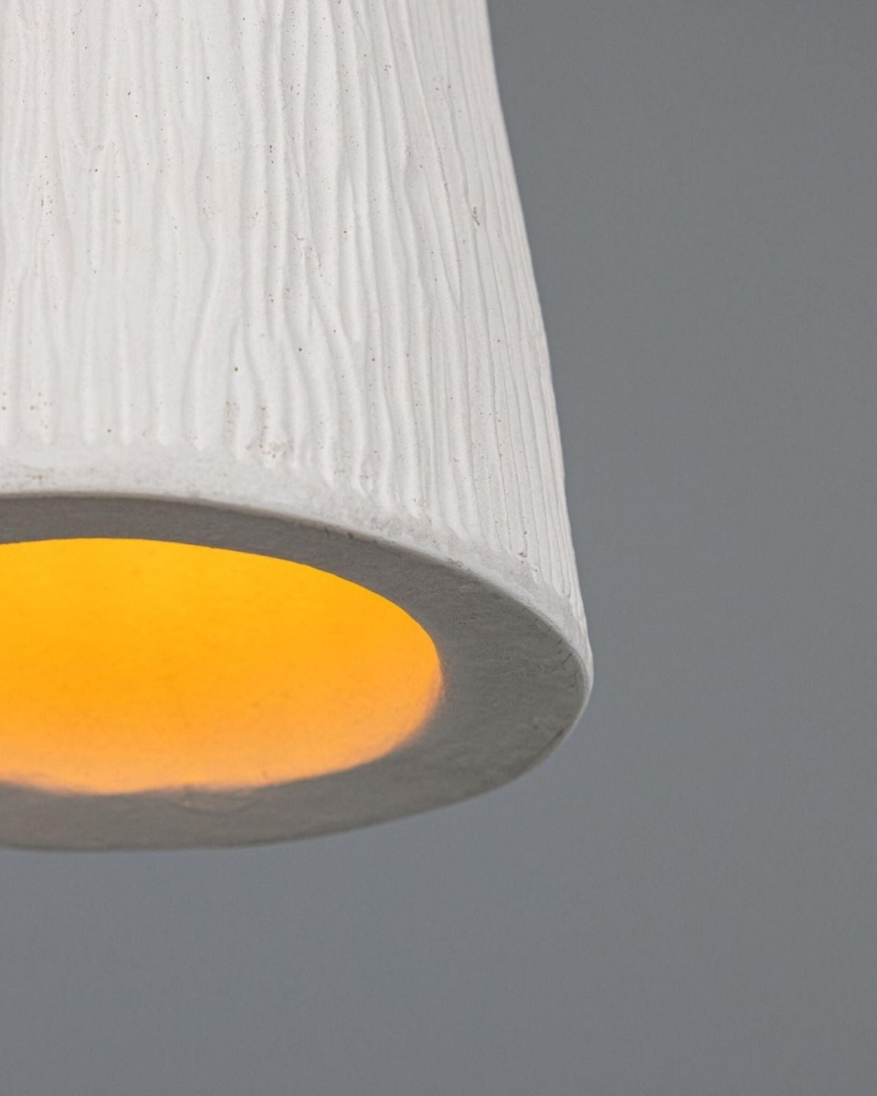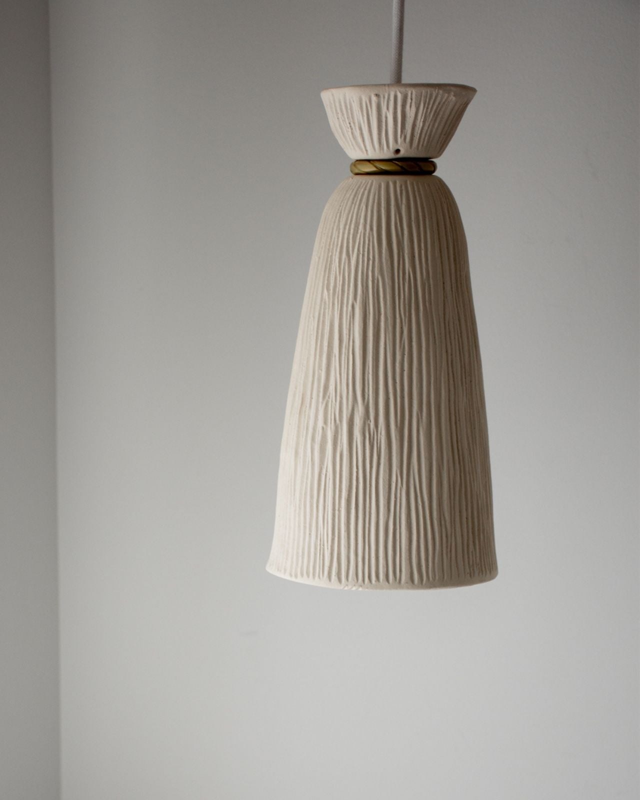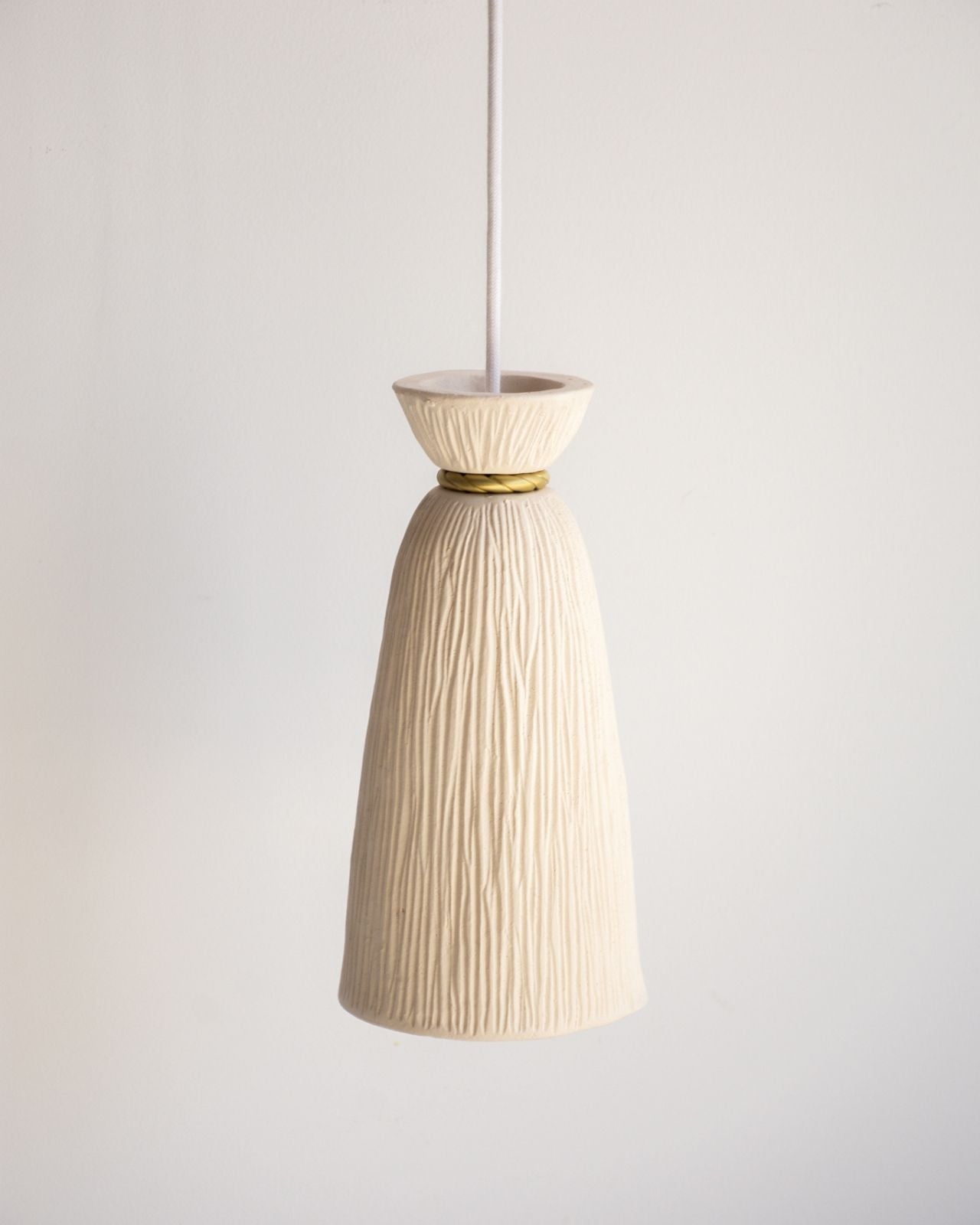 The Long Ceramic Grooved Pendant, crafted in Ireland, draws inspiration from the Aspen tree's tall stature. Its cone-shaped ceramic shade intertwines organic materials with brass, featuring a braided brass ring and hand-carved grooves. Perfect for illuminating dining areas, and corners of living areas, installed on either side of a master bed. This design will add a touch of organic elegance to any room.